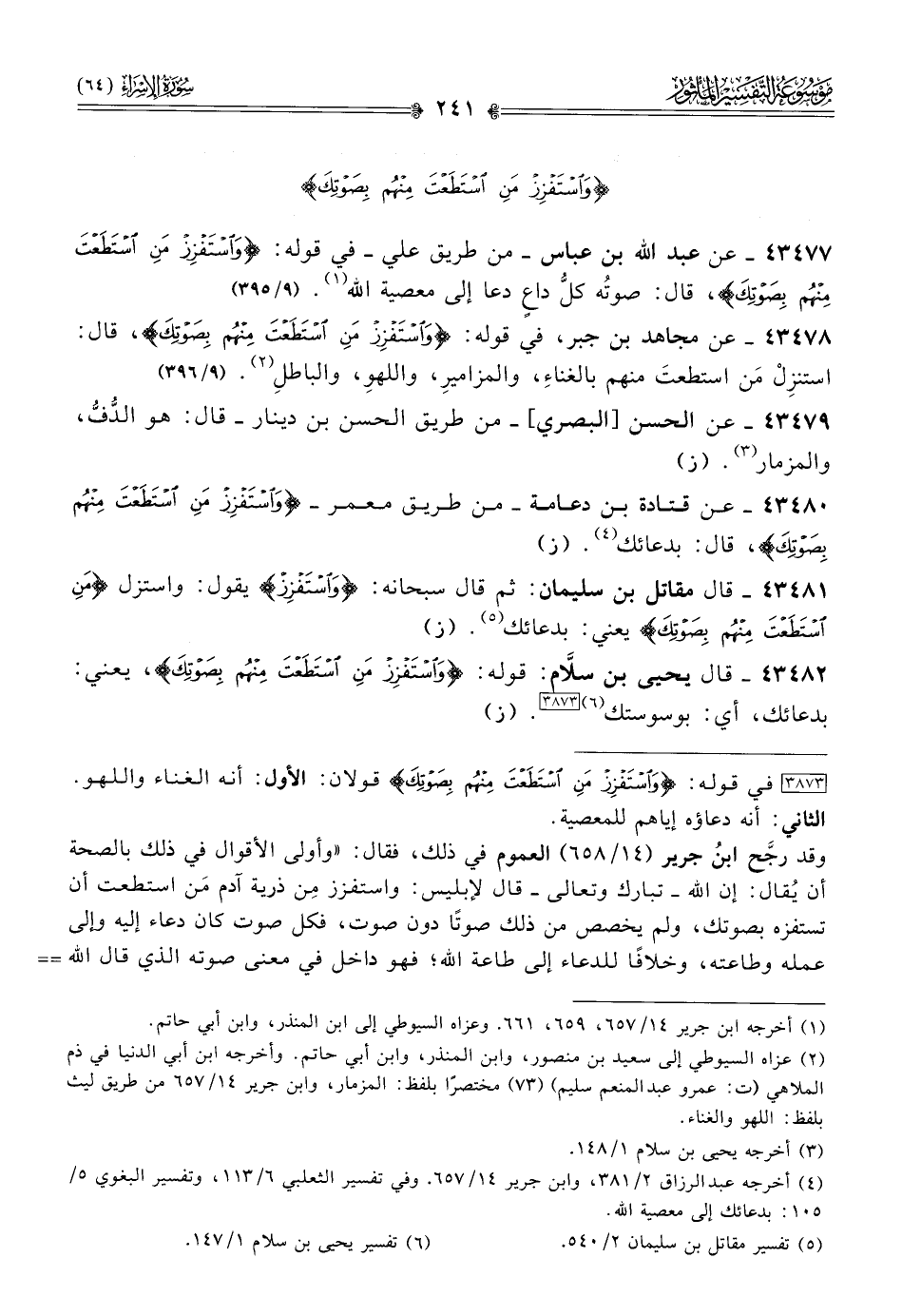 ٤٣٤٨٢ - قال يحيى بن سلّام: قوله: {واستفزز من استطعت منهم بصوتك}، يعني: بدعائك، أي: بوسوستك (¬٦) [٣٨٧٣]. (ز)