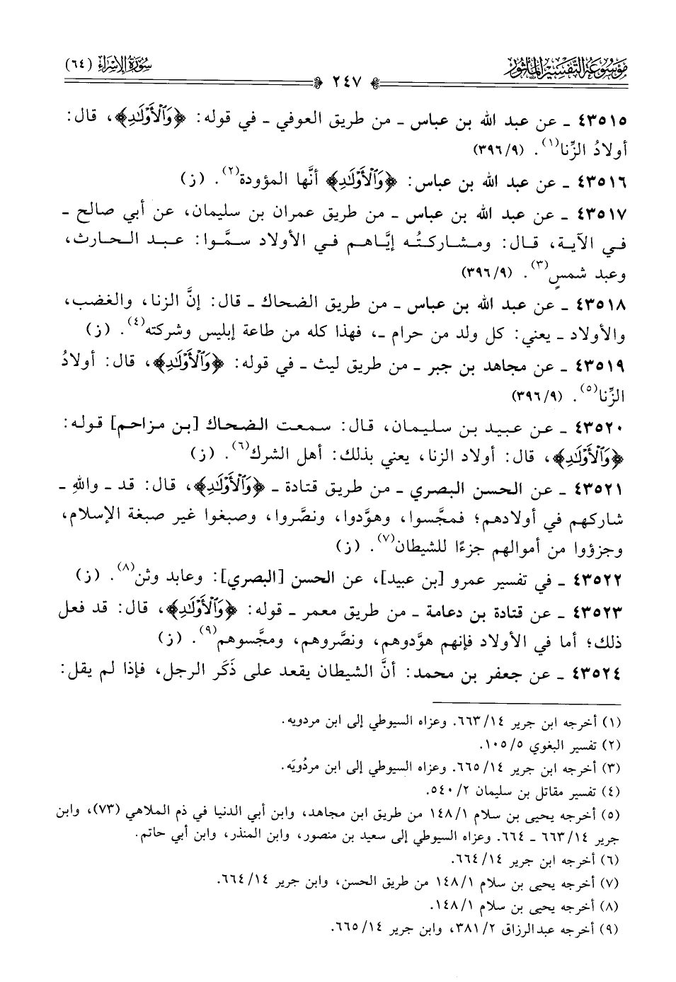 ٤٣٥١٥ - عن عبد الله بن عباس -من طريق العوفي- في قوله: {والأولادِ}، قال: أولادُ الزِّنا (¬١). (٩/ ٣٩٦)