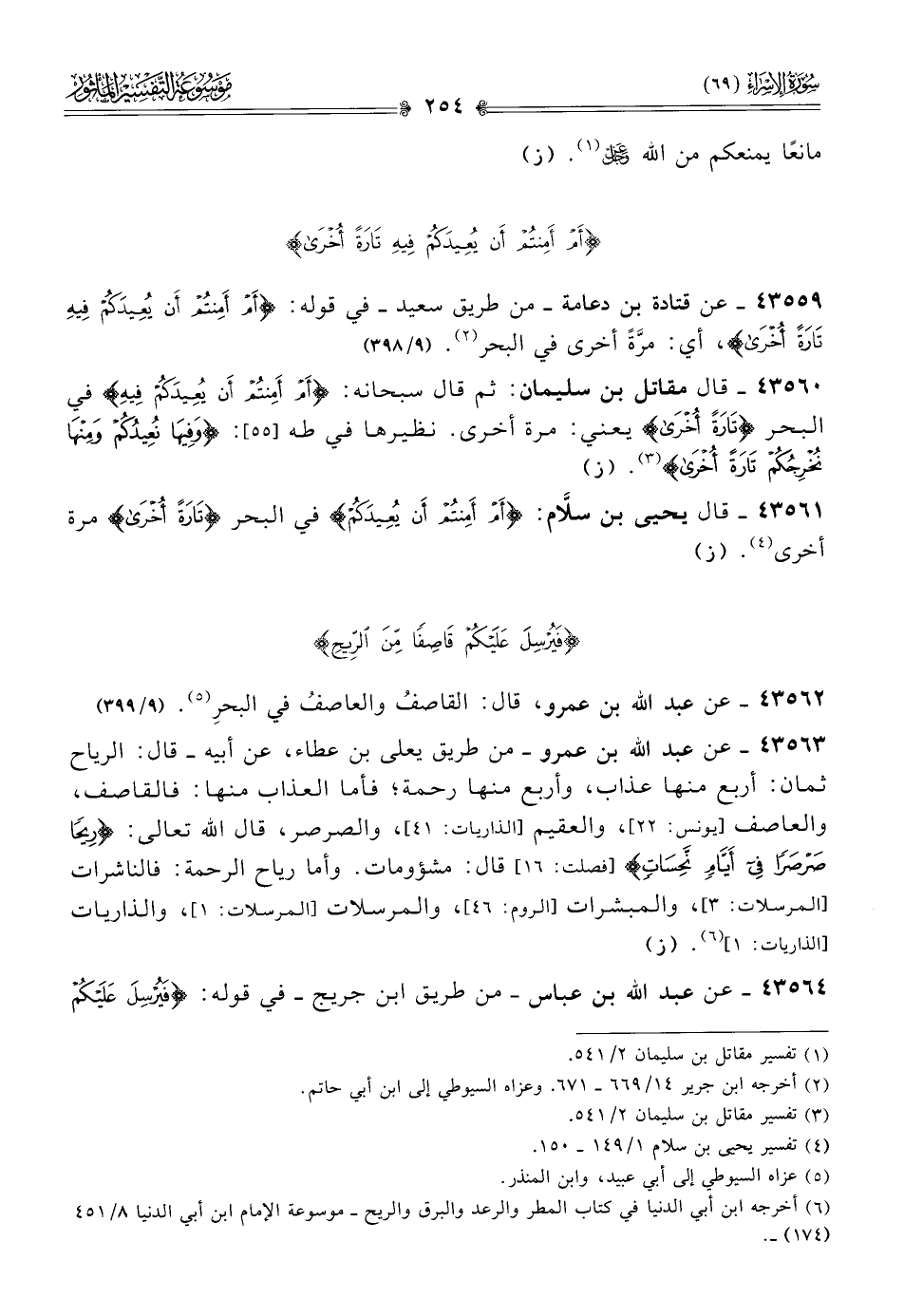 ٤٣٥٥٩ - عن قتادة بن دعامة -من طريق سعيد- في قوله: {أمْ أمنتُم أن يعيدكُم فيه تارةً أُخرى}، أي: مرَّةً أخرى في البحر (¬٢). (٩/ ٣٩٨)