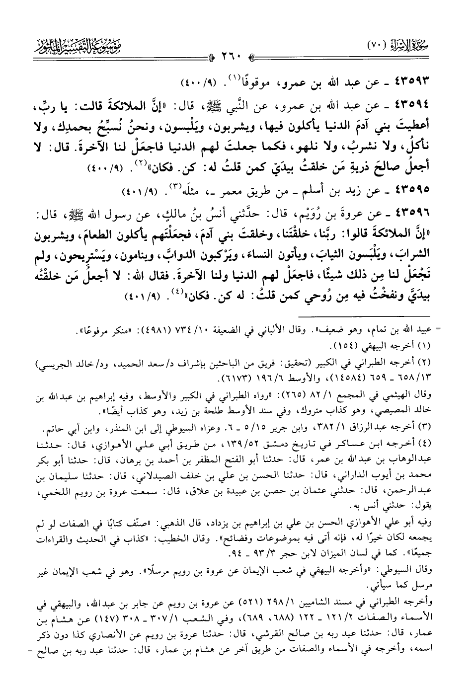 ٤٣٥٩٤ - عن عبد الله بن عمرو، عن النَّبي - صلى الله عليه وسلم -، قال: «إنّ الملائكةَ قالت: يا ربِّ، أعطيتَ بني آدمَ الدنيا يأكلون فيها، ويشربون، ويَلْبسون، ونحنُ نُسبِّحُ بحمدِك، ولا نأكلُ، ولا نشربُ، ولا نلهو، فكما جعلتَ لهم الدنيا فاجعَلْ لنا الآخرةَ. قال: لا أجعلُ صالحَ ذريةِ مَن خلقتُ بيدَيّ كمن قلتُ له: كن. فكان» (¬٢). (٩/ ٤٠٠)