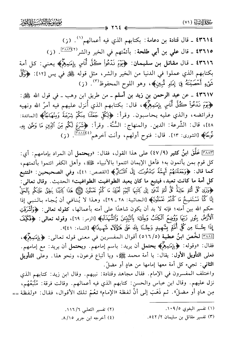 [٣٨٨٣] عَلَّقَ ابنُ كثير (٩/ ٤٧) على هذا القول، فقال: «ويحتمل أن المراد بإمامهم: أي: كل قوم بمن يأتمون به؛ فأهل الإيمان ائتموا بالأنبياء?، وأهل الكفر ائتموا بأئمتهم، كما قال: {وجعلناهم أئمة يدعون إلى النار} [القصص: ٤١]، وفي الصحيحين: «لتتبع كل أمة ما كانت تعبد، فيتبع ما كان يعبد الطواغيت الطواغيت» الحديث. وقال تعالى: {وترى كل أمة جاثية كل أمة تدعى إلى كتابها اليوم تجزون ما كنتم تعملون * هذا كتابنا ينطق عليكم بالحق إنا كنا نستنسخ ما كنتم تعملون} [الجاثية: ٢٨ - ٢٩]، وهذا لا يُنافي أن يُجاء بالنبي إذا حكم الله بين أمته؛ فإنه لا بد أن يكون شاهدًا على أمته بأعمالها، كقوله تعالى: {وأشرقت الأرض بنور ربها ووضع الكتاب وجيء بالنبيين والشهداء} [الزمر: ٦٩]، وقوله تعالى: {فكيف إذا جئنا من كل أمة بشهيد وجئنا بك على هؤلاء شهيدا} [النساء: ٤١]».