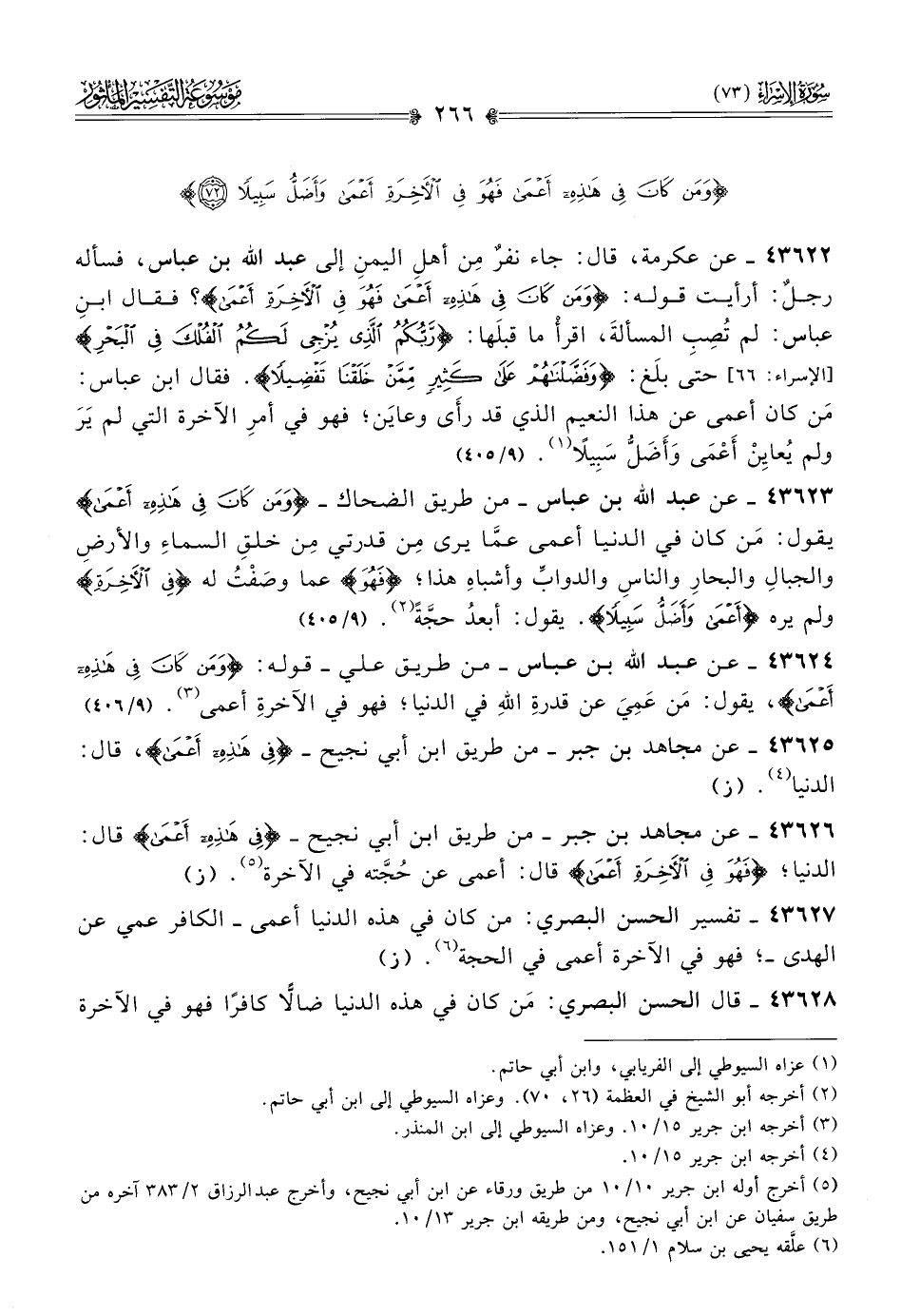٤٣٦٢٢ - عن عكرمة، قال: جاء نفرٌ مِن أهلِ اليمنِ إلى عبد الله بن عباس، فسأله رجلٌ: أرأيت قوله: {ومَن كان فِي هَذِهِ أعمى فَهُوَ فِي الآخِرَةِ أعمى}؟ فقال ابنِ عباس: لم تُصِبِ المسألةَ، اقرأْ ما قبلَها: {رَّبُكُمُ الذِي يُزجِي لَكُمُ الفُلكَ فِي البَحرِ} حتى بلَغ: {وفَضَّلناهُم عَلى كَثِيرٍ مِمَّنْ خَلقنا تَفضِيلًا}. فقال ابن عباس: مَن كان أعمى عن هذا النعيم الذي قد رأى وعايَن؛ فهو في أمرِ الآخرة التي لم يَرَ ولم يُعايِنْ أعْمى وأَضَلُّ سَبِيلًا (¬١). (٩/ ٤٠٥)