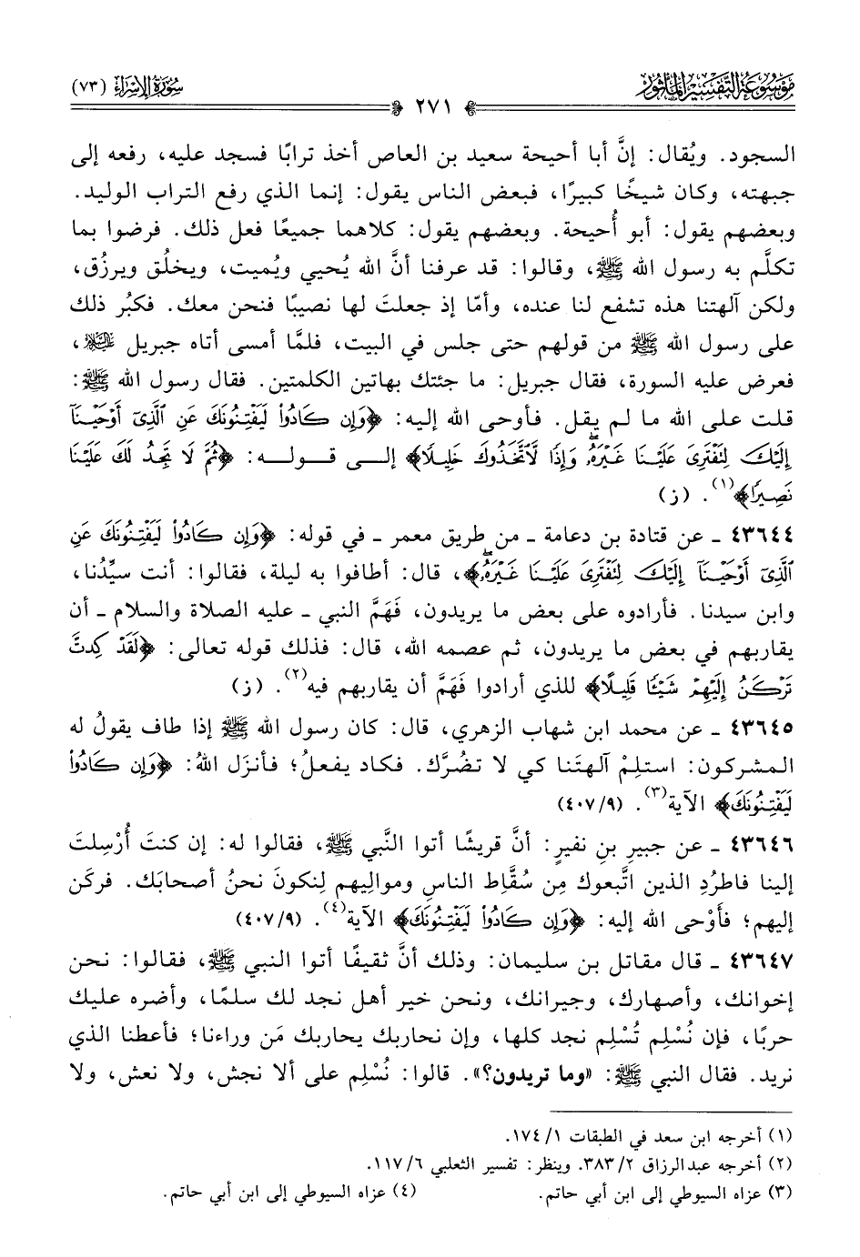٤٣٦٤٥ - عن محمد ابن شهاب الزهري، قال: كان رسول الله - صلى الله عليه وسلم - إذا طاف يقولُ له المشركون: استلِمْ آلهتَنا كي لا تضُرَّك. فكاد يفعلُ؛ فأنزَل اللهُ: {وإن كادُوا لَيَفتِنُونَكَ} الآية (¬٣). (٩/ ٤٠٧)