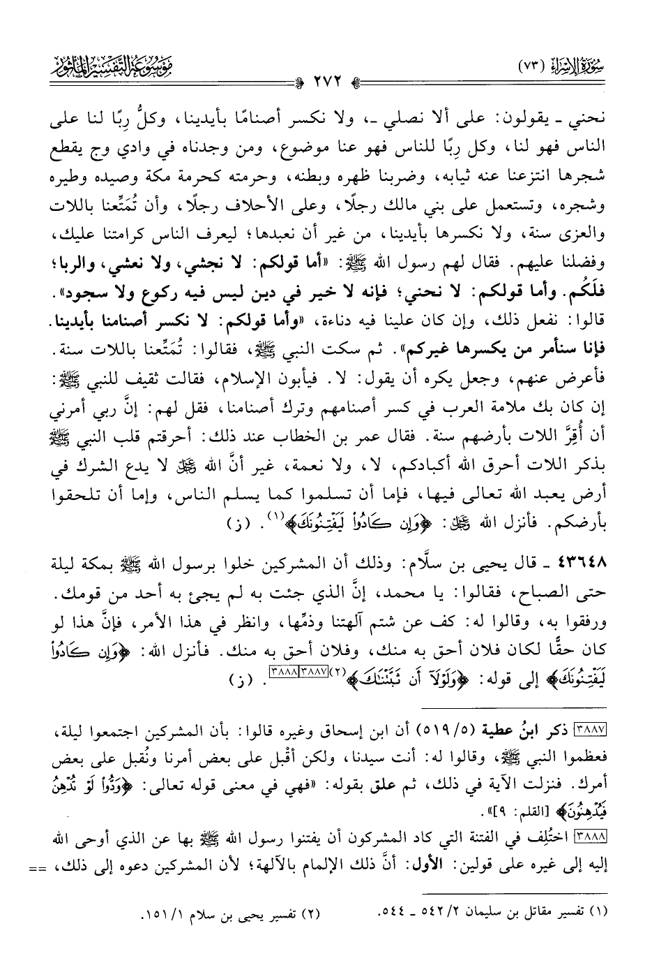 ٤٣٦٤٨ - قال يحيى بن سلّام: وذلك أن المشركين خلوا برسول الله بمكة ليلة حتى الصباح، فقالوا: يا محمد، إنّ الذي جئت به لم يجئ به أحد من قومك. ورفقوا به، وقالوا له: كف عن شتم آلهتنا وذمِّها، وانظر في هذا الأمر، فإنّ هذا لو كان حقًّا لكان فلان أحق به منك، وفلان أحق به منك. فأنزل الله: {وإن كادوا ليفتنونك} إلى قوله: {ولولا أن ثبتناك} (¬٢) [٣٨٨٧] [٣٨٨٨]. (ز)