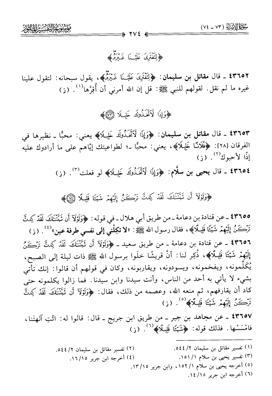 ٤٣٦٥٦ - عن قتادة بن دعامة -من طريق سعيد- {ولولا أن ثبتناك، لقد كدت تركن إليهم شيئا قليلا}، ذُكِر لنا: أنّ قريشًا خلَوا برسول الله - صلى الله عليه وسلم - ذات ليلة إلى الصبح، يُكَلِّمونه، ويفخمونه، ويسودونه، ويقاربونه، وكان في قولهم أن قالوا: إنك تأتي بشيء لا يأتي به أحد من الناس، وأنت سيدنا وابن سيدنا. فما زالوا يكلمونه حتى كاد أن يقارفهم، ثم منعه الله، وعصمه من ذلك، فقال: {ولولا أن ثبتناك لقد كدت تركن إليهم شيئا قليلا} (¬٥). (ز)