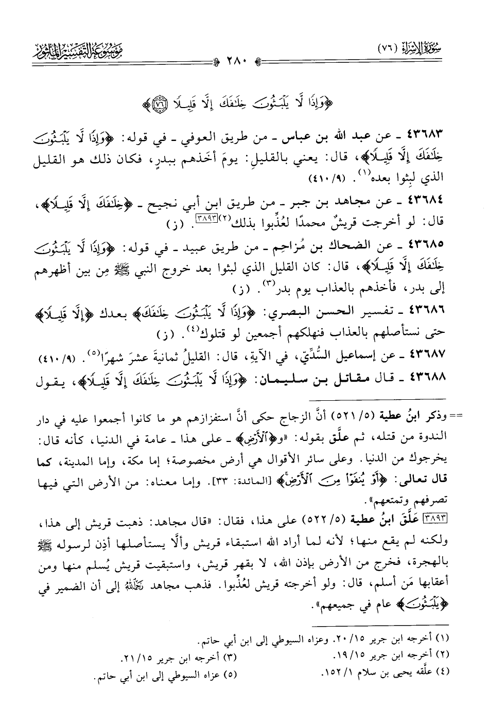 [٣٨٩٣] عَلَّقَ ابنُ عطية (٥/ ٥٢٢) على هذا، فقال: «قال مجاهد: ذهبت قريش إلى هذا، ولكنه لم يقع منها؛ لأنه لما أراد الله استبقاء قريش وألّا يستأصلها أذِن لرسوله - صلى الله عليه وسلم - بالهجرة، فخرج من الأرض بإذن الله، لا بقهر قريش، واستبقيت قريش يُسلم منها ومن أعقابها مَن أسلم، قال: ولو أخرجته قريش لعُذِّبوا. فذهب مجاهد? إلى أن الضمير في {يلبثون} عام في جميعهم».