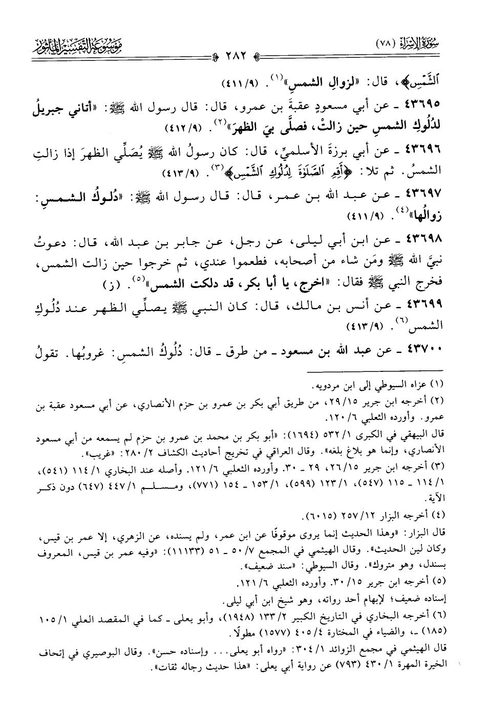 ٤٣٦٩٦ - عن أبي برزةَ الأسلميِّ، قال: كان رسولُ الله - صلى الله عليه وسلم - يُصَلِّي الظهرَ إذا زالتِ الشمسُ. ثم تلا: {أقِمِ الصَّلاةَ لِدُلوُكِ الشَّمسِ} (¬٣). (٩/ ٤١٣)