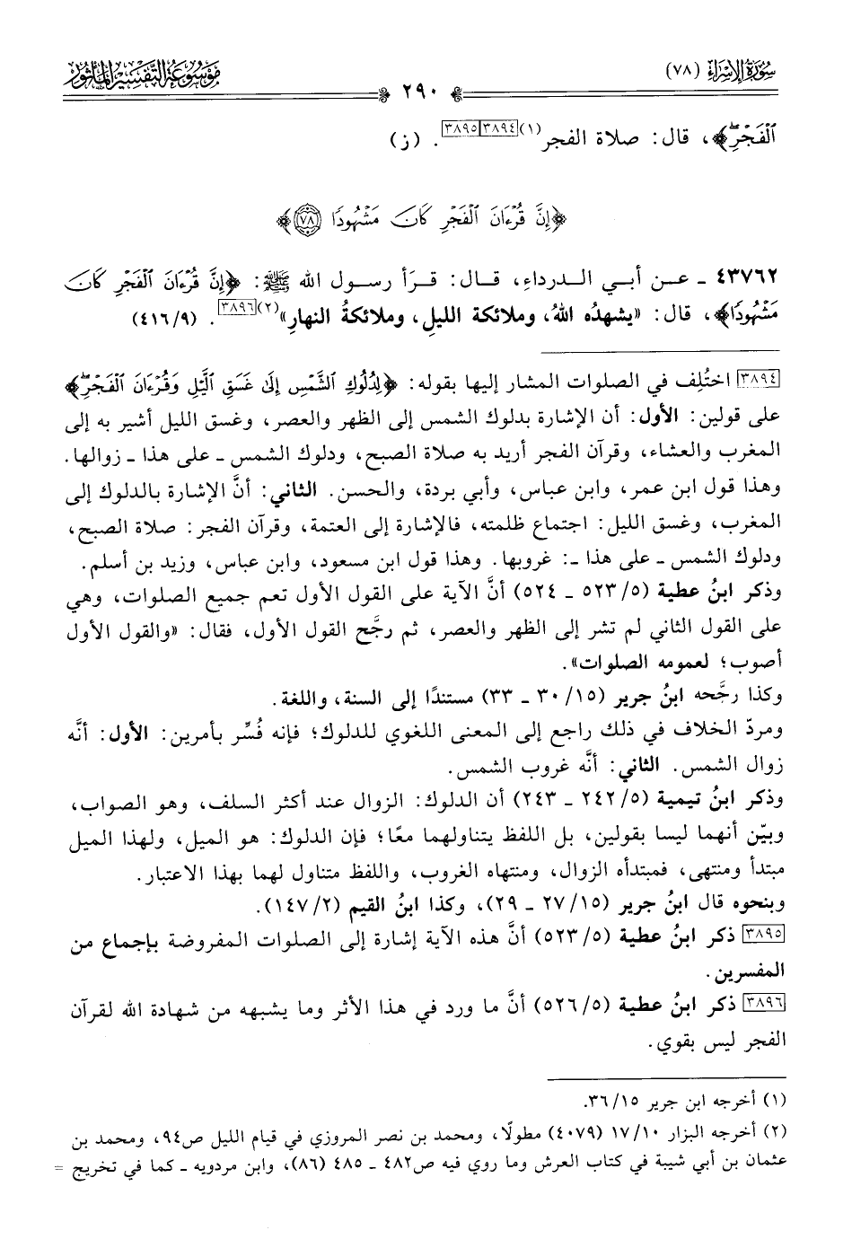 [٣٨٩٤] اختُلِف في الصلوات المشار إليها بقوله: {لدلوك الشمس إلى غسق الليل وقرآن الفجر} على قولين: الأول: أن الإشارة بدلوك الشمس إلى الظهر والعصر، وغسق الليل أشير به إلى المغرب والعشاء، وقرآن الفجر أريد به صلاة الصبح، ودلوك الشمس -على هذا- زوالها. وهذا قول ابن عمر، وابن عباس، وأبي بردة، والحسن. الثاني: أنّ الإشارة بالدلوك إلى المغرب، وغسق الليل: اجتماع ظلمته، فالإشارة إلى العتمة، وقرآن الفجر: صلاة الصبح، ودلوك الشمس -على هذا-: غروبها. وهذا قول ابن مسعود، وابن عباس، وزيد بن أسلم.