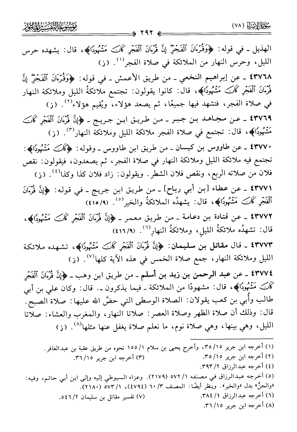 ٤٣٧٦٩ - عن مجاهد بن جبر -من طريق ابن جريج- {إن قرآن الفجر كان مشهودا}، قال: تجتمع في صلاة الفجر ملائكة الليل وملائكة النهار (¬٣). (ز)