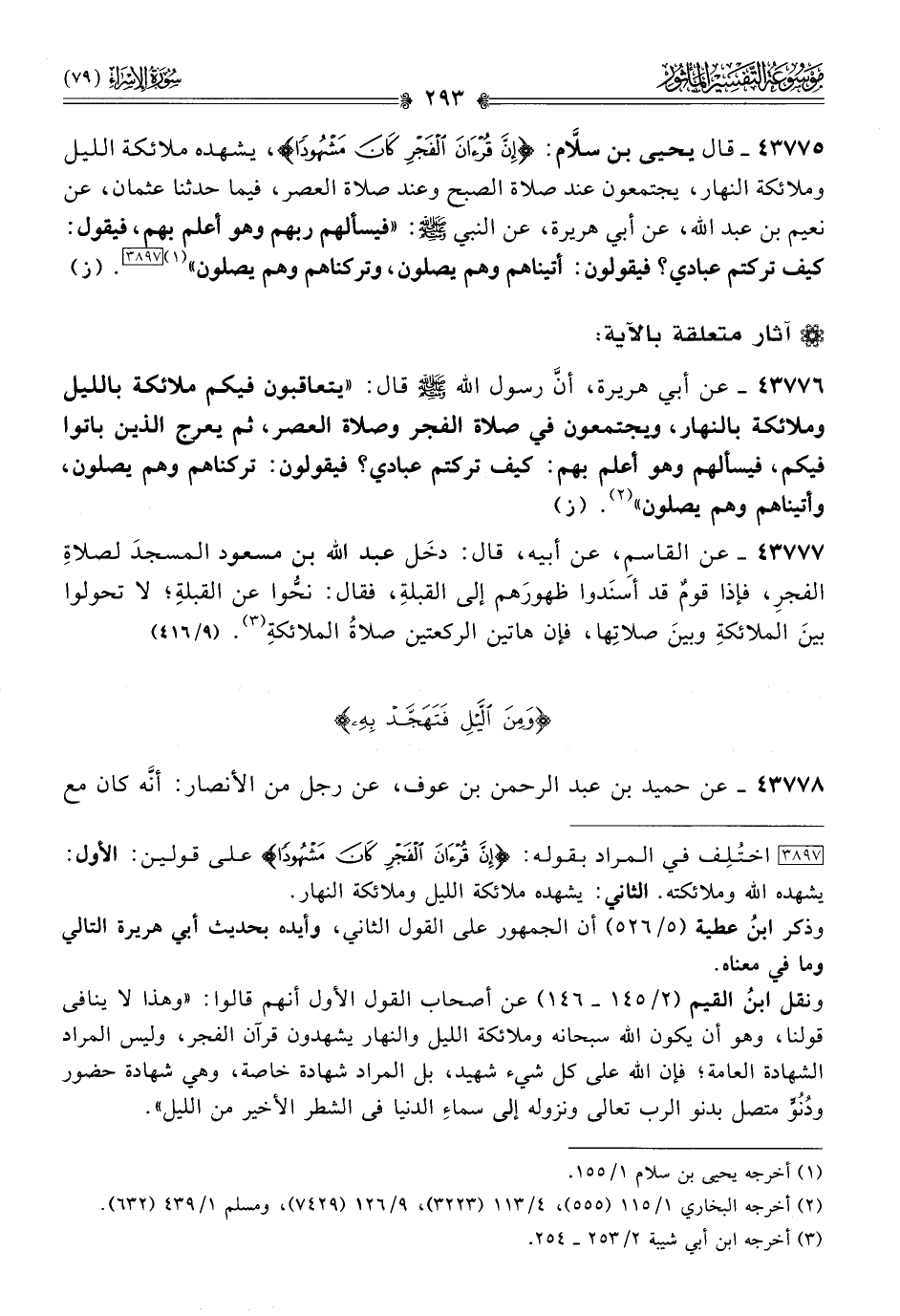 ٤٣٧٧٥ - قال يحيى بن سلّام: {إن قرآن الفجر كان مشهودا}، يشهده ملائكة الليل وملائكة النهار، يجتمعون عند صلاة الصبح وعند صلاة العصر، فيما حدثنا عثمان، عن نعيم بن عبد الله، عن أبي هريرة، عن النبي - صلى الله عليه وسلم -: «فيسألهم ربهم وهو أعلم بهم، فيقول: كيف تركتم عبادي؟ فيقولون: أتيناهم وهم يصلون، وتركناهم وهم يصلون» (¬١) [٣٨٩٧]. (ز)