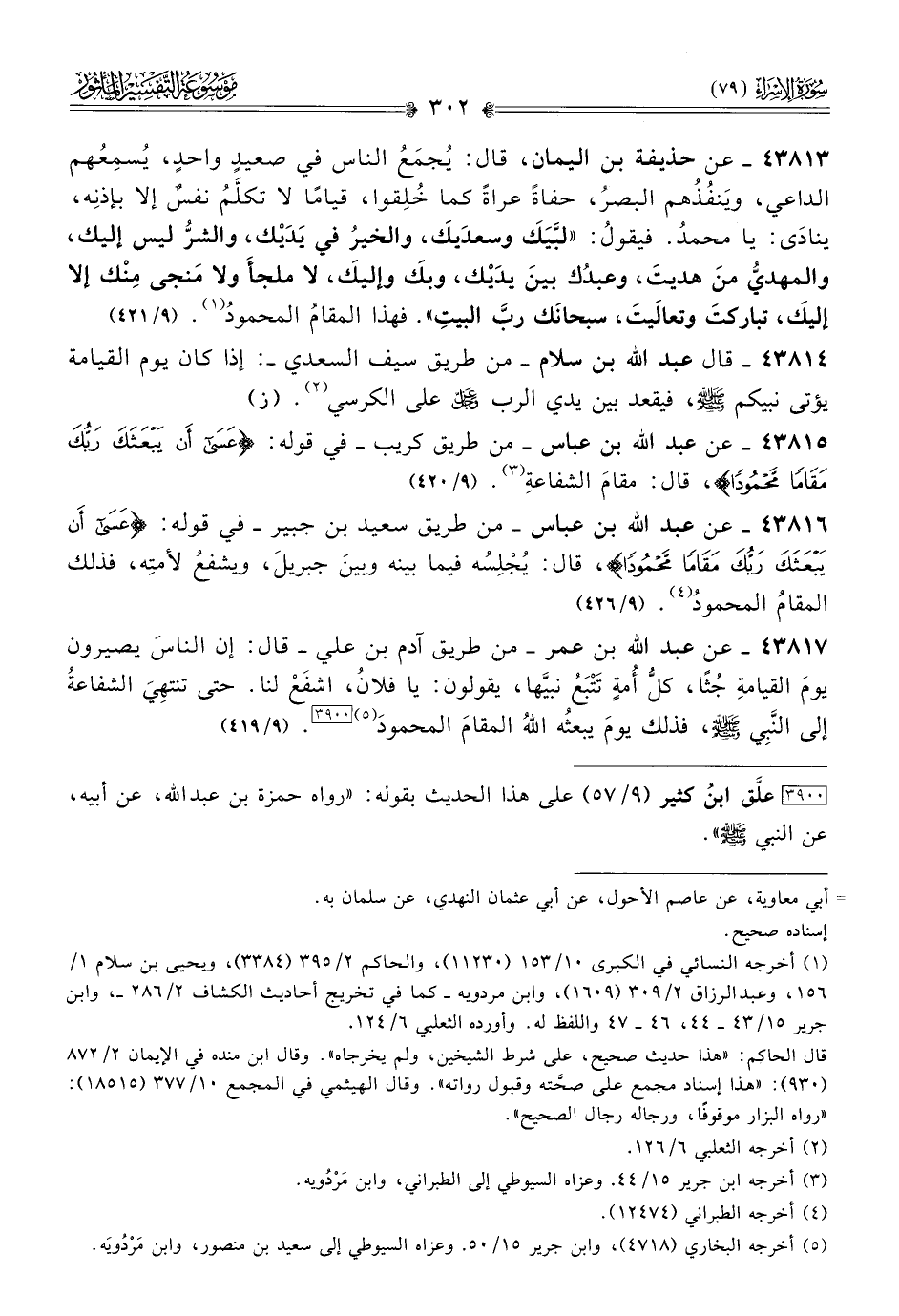 ٤٣٨١٣ - عن حذيفة بن اليمان، قال: يُجمَعُ الناس في صعيدٍ واحدٍ، يُسمِعُهم الداعي، ويَنفُذُهم البصرُ، حفاةً عراةً كما خُلِقوا، قيامًا لا تكلَّمُ نفسٌ إلا بإذنِه، ينادى: يا محمدُ. فيقولُ: «لبَّيَكَ وسعدَيكَ، والخيرُ في يَدَيْك، والشرُّ ليس إليك، والمهديُّ منَ هديتَ، وعبدُك بينَ يدَيْك، وبكَ وإليكَ، لا ملجأَ ولا مَنجى مِنك إلا إليكَ، تباركتَ وتعالَيتَ، سبحانَك ربَّ البيتِ». فهذا المقامُ المحمودُ (¬١). (٩/ ٤٢١)