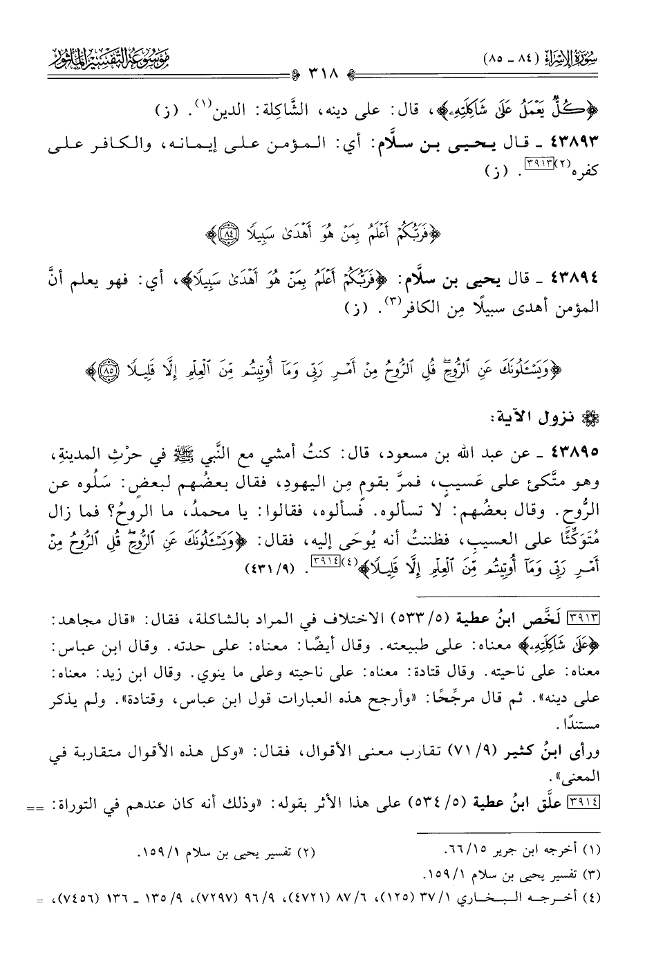 [٣٩١٤] علَّق ابنُ عطية (٥/ ٥٣٤) على هذا الأثر بقوله: «وذلك أنه كان عندهم في التوراة: أنّ الروح مما انفرد الله بعلمه، ولا يُطلع عليه أحدًا من عباده». ثم علَّق على عبارة بعضهم: لا تسألوه. بقوله: «يعني: -والله أعلم- مِن أنه لا يفسره، فتقوى الحجة عليهم في نبوته». وذكر أن الضمير في {ويسألونك} لليهود، والآية مدنية.