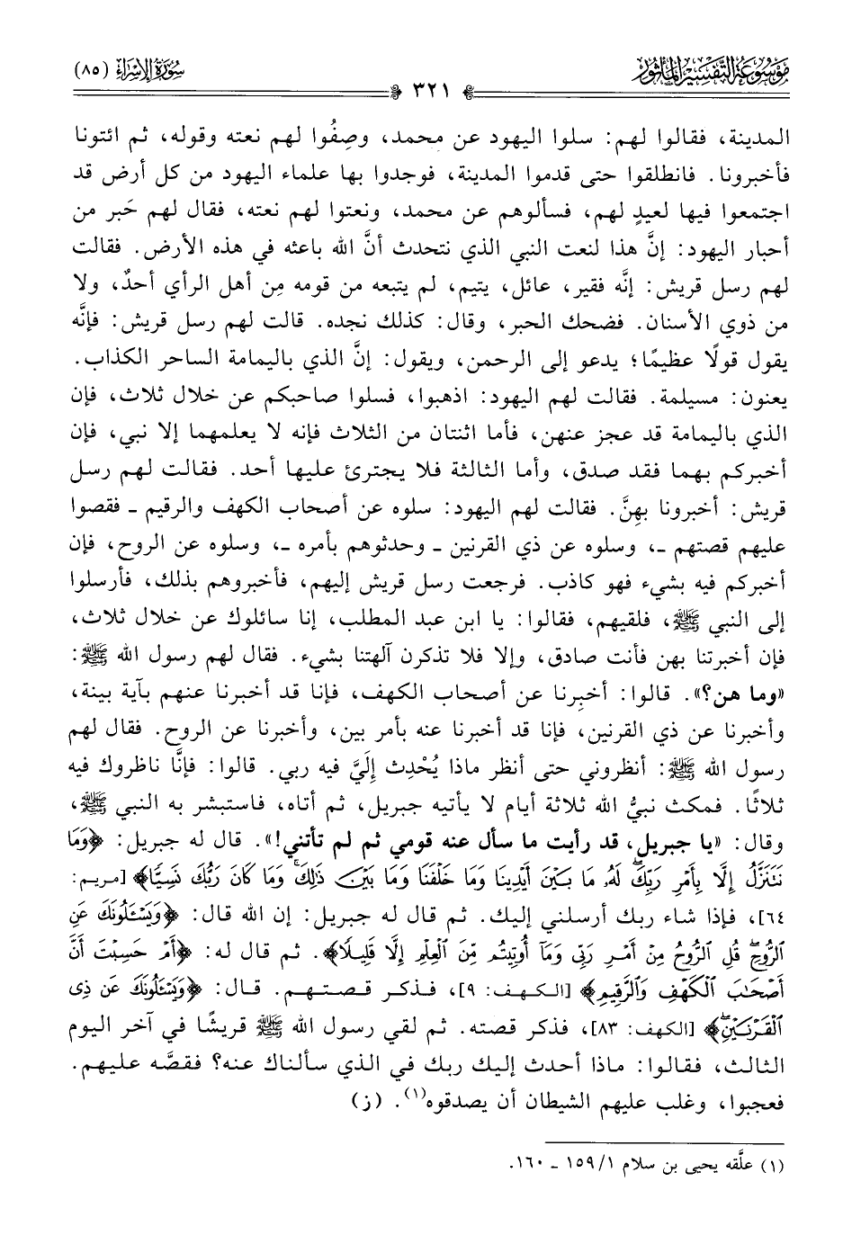 المدينة، فقالوا لهم: سلوا اليهود عن محمد، وصِفُوا لهم نعته وقوله، ثم ائتونا فأخبرونا. فانطلقوا حتى قدموا المدينة، فوجدوا بها علماء اليهود من كل أرض قد اجتمعوا فيها لعيدٍ لهم، فسألوهم عن محمد، ونعتوا لهم نعته، فقال لهم حَبر من أحبار اليهود: إنّ هذا لنعت النبي الذي نتحدث أنّ الله باعثه في هذه الأرض. فقالت لهم رسل قريش: إنّه فقير، عائل، يتيم، لم يتبعه من قومه مِن أهل الرأي أحدٌ، ولا من ذوي الأسنان. فضحك الحبر، وقال: كذلك نجده. قالت لهم رسل قريش: فإنّه يقول قولًا عظيمًا؛ يدعو إلى الرحمن، ويقول: إنّ الذي باليمامة الساحر الكذاب. يعنون: مسيلمة. فقالت لهم اليهود: اذهبوا، فسلوا صاحبكم عن خلال ثلاث، فإن الذي باليمامة قد عجز عنهن، فأما اثنتان من الثلاث فإنه لا يعلمهما إلا نبي، فإن أخبركم بهما فقد صدق، وأما الثالثة فلا يجترئ عليها أحد. فقالت لهم رسل قريش: أخبرونا بهِنَّ. فقالت لهم اليهود: سلوه عن أصحاب الكهف والرقيم -فقصوا عليهم قصتهم-، وسلوه عن ذي القرنين -وحدثوهم بأمره-، وسلوه عن الروح، فإن أخبركم فيه بشيء فهو كاذب. فرجعت رسل قريش إليهم، فأخبروهم بذلك، فأرسلوا إلى النبي، فلقيهم، فقالوا: يا ابن عبد المطلب، إنا سائلوك عن خلال ثلاث، فإن أخبرتنا بهن فأنت صادق، وإلا فلا تذكرن آلهتنا بشيء. فقال لهم رسول الله: «وما هن؟». قالوا: أخبِرنا عن أصحاب الكهف، فإنا قد أخبرنا عنهم بآية بينة، وأخبرنا عن ذي القرنين، فإنا قد أخبرنا عنه بأمر بين، وأخبرنا عن الروح. فقال لهم رسول الله ×: أنظروني حتى أنظر ماذا يُحْدِث إلَيَّ فيه ربي. قالوا: فإنّا ناظروك فيه ثلاثًا. فمكث نبيُّ الله ثلاثة أيام لا يأتيه جبريل، ثم أتاه، فاستبشر به النبي ×، وقال: «يا جبريل، قد رأيت ما سأل عنه قومي ثم لم تأتني!». قال له جبريل: {وما نتنزل إلا بأمر ربك له ما بين أيدينا وما خلفنا وما بين ذلك وما كان ربك نسيا} [مريم: ٦٤]، فإذا شاء ربك أرسلني إليك. ثم قال له جبريل: إن الله قال: {ويسألونك عن الروح قل الروح من أمر ربي وما أوتيتم من العلم إلا قليلا}. ثم قال له: {أم حسبت أن أصحاب الكهف والرقيم} [الكهف: ٩]، فذكر قصتهم. قال: {ويسألونك عن ذي القرنين} [الكهف: ٣]، فذكر قصته. ثم لقي رسول الله قريشًا في آخر اليوم الثالث، فقالوا: ماذا أحدث إليك ربك في الذي سألناك عنه؟ فقصَّه عليهم. فعجبوا، وغلب عليهم الشيطان أن يصدقوه (¬١). (ز)