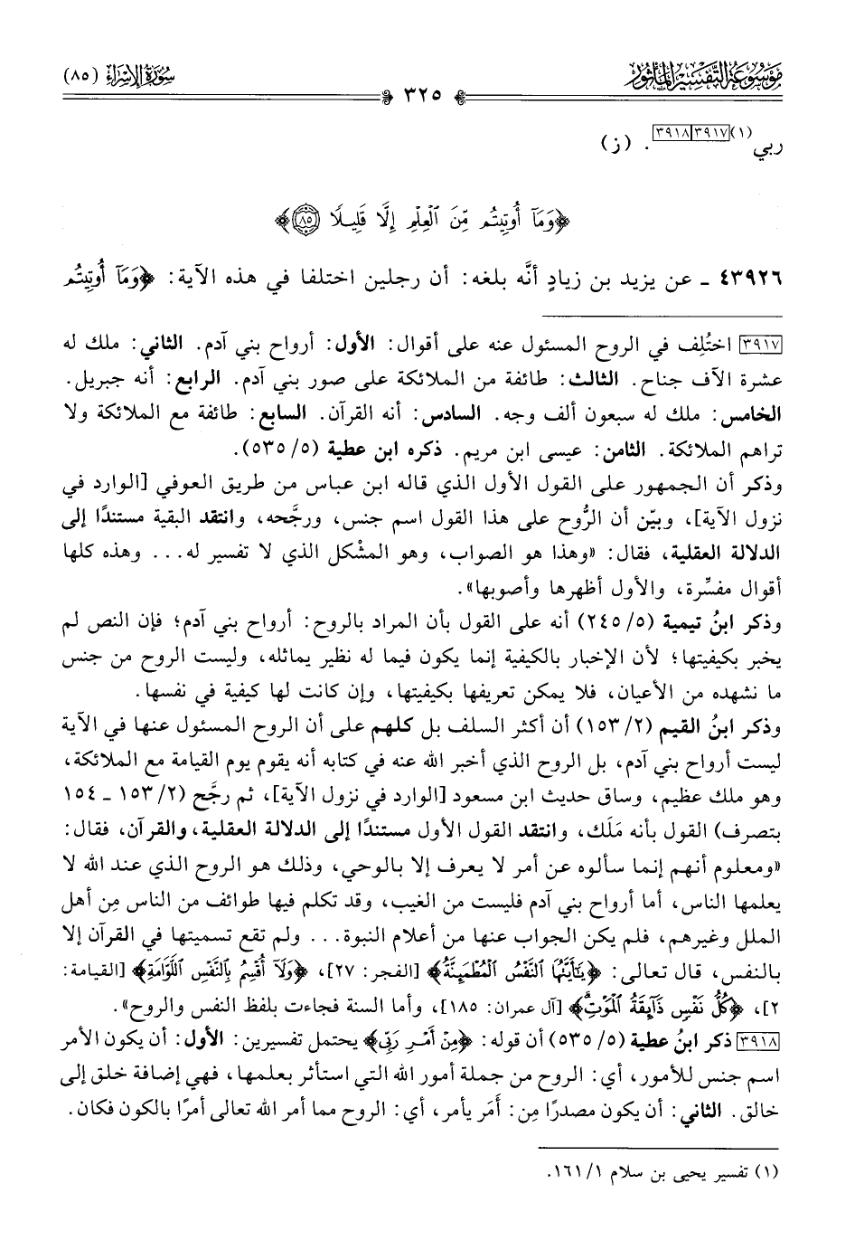 وذكر ابنُ القيم (٢/ ١٥٣) أن أكثر السلف بل كلهم على أن الروح المسئول عنها في الآية ليست أرواح بني آدم، بل الروح الذي أخبر الله عنه في كتابه أنه يقوم يوم القيامة مع الملائكة، وهو ملك عظيم، وساق حديث ابن مسعود [الوارد في نزول الآية]، ثم رجَّح (٢/ ١٥٣ - ١٥٤ بتصرف) القول بأنه مَلَك، وانتقد القول الأول مستندًا إلى الدلالة العقلية، والقرآن، فقال: «ومعلوم أنهم إنما سألوه عن أمر لا يعرف إلا بالوحي، وذلك هو الروح الذي عند الله لا يعلمها الناس، أما أرواح بني آدم فليست من الغيب، وقد تكلم فيها طوائف من الناس مِن أهل الملل وغيرهم، فلم يكن الجواب عنها من أعلام النبوة ... ولم تقع تسميتها في القرآن إلا بالنفس، قال تعالى: {يا أيتها النفس المطمئنة} [الفجر: ٢٧]، {ولا أقسم بالنفس اللوامة} [القيامة: ٢]، {كل نفس ذائقة الموت} [آل عمران: ١٨٥]، وأما السنة فجاءت بلفظ النفس والروح».