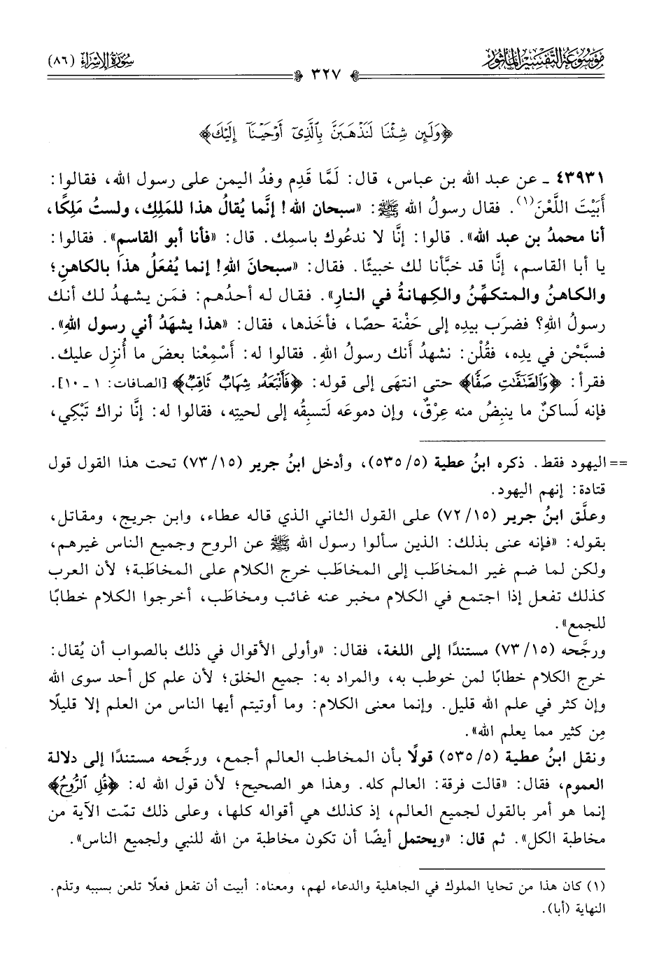 ٤٣٩٣١ - عن عبد الله بن عباس، قال: لَمّا قَدِم وفدُ اليمن على رسول الله - صلى الله عليه وسلم -، فقالوا: أبَيْتَ اللَّعْنَ (¬١). فقال رسولُ الله - صلى الله عليه وسلم -: «سبحان الله! إنّما يُقالُ هذا للمَلِكِ، ولستُ مَلِكًا، أنا محمدُ بن عبد الله». قالوا: إنّا لا ندعُوك باسمِك. قال: «فأنا أبو القاسمِ». فقالوا: يا أبا القاسم، إنّا قد خبَّأنا لك خبيئًا. فقال: «سبحانَ اللهِ! إنما يُفعَلُ هذا بالكاهنِ؛ والكاهنُ والمتكهِّنُ والكِهانةُ في النارِ». فقال له أحدُهم: فمَن يشهدُ لك أنك رسولُ اللهِ؟ فضرَب بيدِه إلى حَفْنة حصًا، فأخَذها، فقال: «هذا يشهَدُ أني رسول اللهِ». فسبَّحْن في يدِه، فقُلْن: نشهدُ أنك رسولُ اللهِ. فقالوا له: أسْمِعْنا بعضَ ما أُنزِل عليك. فقرأ: {والصّافاتِ صَفًا} حتى انتهى إلى قوله: {فَأَتْبَعَهُ شِهابٌ ثاقِبٌ} [الصافات: ١ - ١٠]. فإنه لَساكنٌ ما ينبِضُ منه عِرْقٌ، وإن دموعَه لَتسبِقُه إلى لحيتِه، فقالوا له: إنّا نراك تَبْكِي،