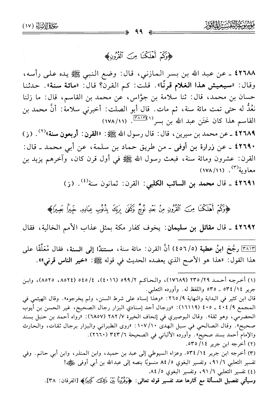 ٤٢٦٩٠ - عن زرارة بن أوفى -من طريق حماد بن سلمة، عن أبي محمد- قال: القرن: عشرون ومائة سنة، فبعث رسول الله - صلى الله عليه وسلم - في أول قرن كان، وآخرهم يزيد بن معاوية (¬٣). (١١/ ١٧٨)