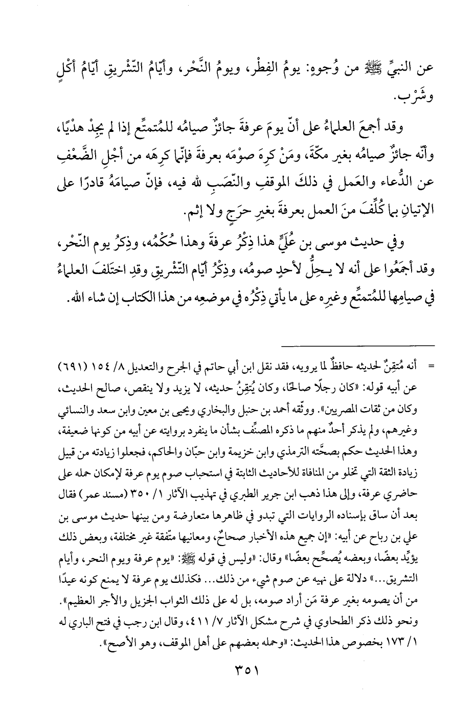= أنه مُتقِنٌ لحديثه حافظٌ لما يرويه، فقد نقل ابن أبي حاتم في الجرح والتعديل ٨/ ١٥٤ (٦٩١) عن أبيه قوله: "كان رجلًا صالحًا، وكان يُتقِنُ حديثه، لا يزيد ولا ينقص، صالح الحديث، وكان من ثقات المصريين". ووثّقه أحمد بن حنبل والبخاري ويحيى بن معين وابن سعد والنسائي وغيرهم، ولم يذكر أحدٌ منهم ما ذكره المصنِّف بشأن ما ينفرد بروايته عن أبيه من كونها ضعيفة، وهذا الحديث حكم بصحَّته الترمذي وابن خزيمة وابن حبّان والحاكم، فجعلوا زيادته من قبيل زيادة الثقة التي تخلو من المنافاة للأحاديث الثابتة في استحباب صوم يوم عرفة لإمكان حمله على حاضري عرفة، وإلى هذا ذهب ابن جرير الطبري في تهذيب الآثار ١/ ٣٥٠ (مسند عمر) فقال بعد أن ساق بإسناده الروايات التي تبدو في ظاهرها متعارضة ومن بينها حديث موسى بن علي بن رباح عن أبيه: "إن جميع هذه الأخبار صحاحٌ، ومعانيها متّفقة غير مختلفة، وبعض ذلك يؤيِّد بعضًا، وبعضه يُصحِّح بعضًا" وقال: "وليس في قوله -صلى اللَّه عليه وسلم-: "يوم عرفة ويوم النحر، وأيام التشريق. . . " دلالة على نهيه عن صوم شيء من ذلك. . . فكذلك يوم عرفة لا يمنع كونه عيدًا من أن يصومه بغير عرفة مَن أراد صومه، بل له على ذلك الثواب الجزيل والأجر العظيم". ونحو ذلك ذكر الطحاوي في شرح مشكل الآثار ٧/ ٤١١، وقال ابن رجب في فتح الباري له ١/ ١٧٣ بخصوص هذا الحديث: "وحمله بعضهم على أهل الموقف، وهو الأصح".