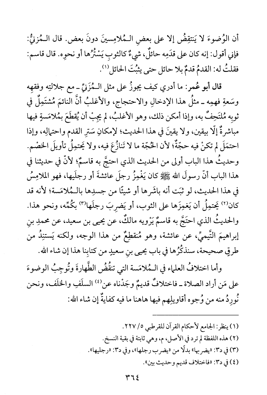 قال أبو عُمر: ما أدري كيف يجوزُ على مثل المُزَنيِّ -مع جلالتِه وفقهِه وسَعةِ فهمِه- مثلُ هذا الإدخالِ والاحتجاج، والأغلبُ أنَّ النائمَ مُشتَمِلٌ في ثوبِه مُلتَحِفٌ به، وإذا أمكن ذلك، وهو الأغلبُ، لم يجِبْ أن يُقطَعَ بمُلامَسةٍ فيها مباشرةٌ إلّا بيقين، ولا يقينَ في هذا الحديث؛ لإمكانِ سَترِ القدم واحتمالِه، وإذا احتمَلَ لم تكنْ فيه حجّةٌ؛ لأن الحُجّة ما لا تَنازُعَ فيه، ولا يَحتمِلُ تأويلَ الخصْم. وحديثُ هذا الباب أولى من الحديث الذي احتجَّ به قاسمٌ؛ لأنّ في حديثنا في هذا الباب أنّ رسولَ اللَّه -صلى اللَّه عليه وسلم- كان يَغْمِزُ رجلَ عائشةَ أو رجلَيها، فهو الملامِسُ في هذا الحديث، لو ثبَت أنه باشَرها أو شيئًا من جسدِها بالمُلامَسة؛ لأنه قد كان (¬٢) يَحتمِلُ أن يَغمِزَها على الثوب، أو يَضرِبَ رجلَها (¬٣) بكُمِّه، ونحو هذا. والحديثُ الذي احتَجَّ به قاسمٌ يَرْويه مالكٌ، عن يحيى بن سعيد، عن محمدِ بنِ إبراهيمَ التَّيميِّ، عن عائشة، وهو مُنقطِعٌ من هذا الوجه، ولكنه يَستنِدُ من طرقٍ صحيحة، سنذكُرُها في باب يحيى بنِ سعيدٍ من كتابِنا هذا إن شاء اللَّه.