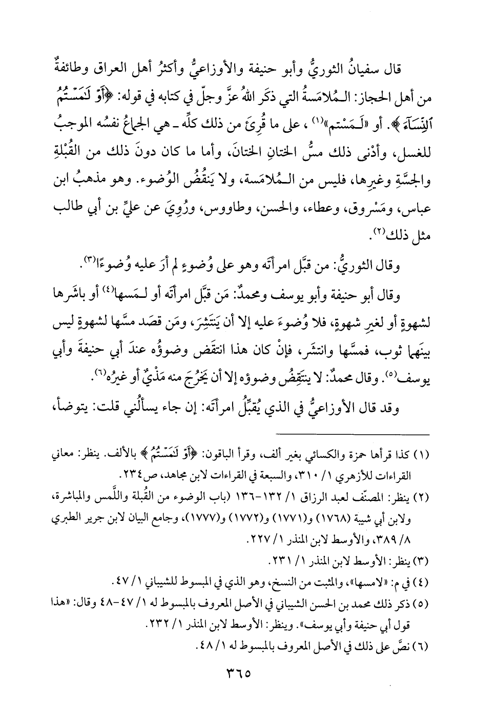 (¬٢) ينظر: المصنّف لعبد الرزاق ١/ ١٣٢ - ١٣٦ (باب الوضوء من القُبلة واللَّمس والمباشرة، ولابن أبي شيبة (١٧٦٨) و (١٧٧١) و (١٧٧٢) و (١٧٧٧)، وجامع البيان لابن جرير الطبري ٨/ ٣٨٩، والأوسط لابن المنذر ١/ ٢٢٧.