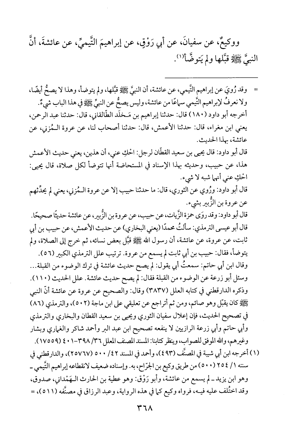 وقال ابن أبي حاتم: سمعتُ أبي يقول: لم يصح حديث عائشة في ترك الوضوء من القبلة. . . وسئل أبو زرعة عن الوضوء من القبلة فقال: لم يصح حديث عائشة. علل الحديث (١١٠). وذكره الدارقطني في كتابه العلل (٣٨٣٧) وقال: والصحيح عن عروة عن عائشة أنّ النبي -صلى اللَّه عليه وسلم- كان يقبّل وهو صائم، ومن ثم أتراجع عن تعليقي على ابن ماجة (٥٠٢)، والترمذي (٨٦) في تصحيح الحديث، فإن إعلال سفيان الثوري ويحيى بن سعيد القطان والبخاري والترمذي وأبي حاتم وأبي زرعة الرازيين لا ينفعه تصحيح ابن عبد البر وأحمد شاكر والغماري وبشار وغيرهم، واللَّه الموفق للصواب، وينظر كتابنا: المسند المصنف المعلل ٣٦/ ٣٩٨ - ٤٠١ (١٧٥٥٩).