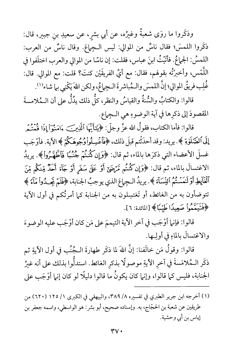 وذكَروا ما روَى شعبةُ وغيرُه، عن أبي بشرٍ، عن سعيدِ بنِ جبير، قال: ذكَروا اللمسَ؛ فقال ناسٌ من الموالي: ليس الجِماعَ. وقال ناسٌ من العرب: اللمسُ: الجماعُ. فأتَيْتُ ابنَ عباس، فقلت: إن ناسًا من الموالي والعرب اختلَفوا في اللَّمْس، وأخبرْتُه بقولهم، فقال: مع أيِّ الفريقَيْن كنتَ؟ قلت: مع الموالي. قال: غُلِب فريقُ الموالي؛ إنَّ اللمسَ والمُباشرةَ الجِماعُ، ولكن اللَّهَ يَكْنِي بما شاء (¬١).