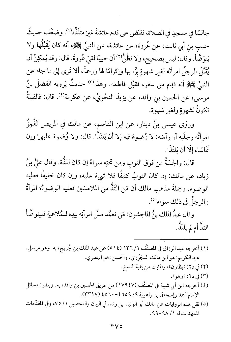 جالسًا في مسجدٍ في الصلاة، فقبَض على قدم عائشةَ غيرَ متلَذِّذ (¬١). وضعَّف حديثَ حبيبِ بنِ أبي ثابت، عن عُروة، عن عائشة، عن النبيِّ -صلى اللَّه عليه وسلم-، أنه كان يُقَبِّلُها ولا يَتوَضَّأ. وقال: ليس بصحيح، ولا نظُنُّ (¬٢) أن حبيبًا لقيَ عُروةَ. قال: وقد يُمكِنُ أن يُقَبِّلَ الرجلُ امرأتَه لغير شهوةٍ بِرًّا بها وإكرامًا لها ورحمةً، ألا تَرى إلى ما جاء عن النبيِّ -صلى اللَّه عليه وسلم- أنه قدِم من سفر، فقبَّل فاطمة. وهذا (¬٣) حديثٌ يَرويه الفضلُ بنُ موسى، عن الحسين بنِ واقد، عن يزيدَ النحْويِّ، عن عكرمة (¬٤). قال: فالقبلةُ تكونُ لشهوةٍ ولغير شهوة.