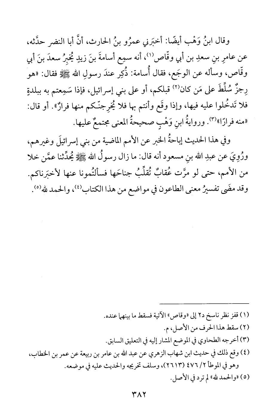 وقال ابنُ وَهْب أيضًا: أخبَرني عمرُو بنُ الحارث، أنَّ أبا النضر حدَّثه، عن عامرِ بنِ سعدِ بن أبي وقّاص (¬١)، أنه سمِع أسامةَ بنَ زيدٍ يُخبِرُ سعدَ بنَ أبي وقّاص، وسأله عن الوجَع، فقال أُسامة: ذُكِر عندَ رسولِ اللَّه -صلى اللَّه عليه وسلم- فقال: "هو رِجزٌ سُلِّطَ على مَن كان (¬٢) قبلكم، أو على بني إسرائيل، فإذا سَمِعتم به ببلدةٍ فلا تَدخُلوا عليه فيها، وإذا وقَع وأنتم بها فلا يُخرِجنّكم منها فرارٌ". أو قال: "منه فرارًا" (¬٣). وروايةُ ابنِ وَهْبٍ صحيحةُ المعنى مجتمعٌ عليها.