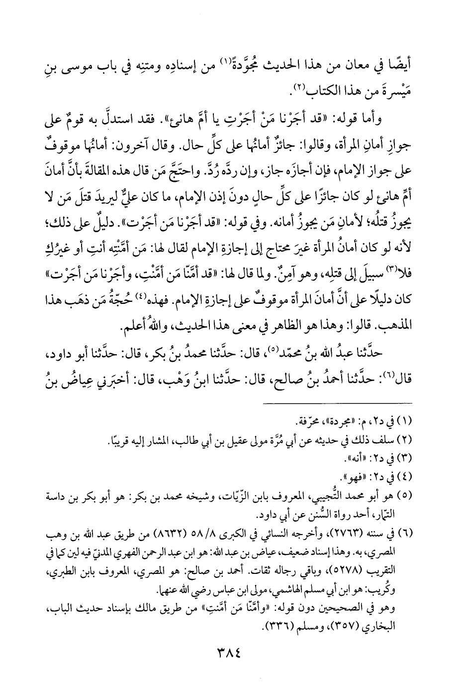 وأما قوله: "قد أجَرْنا مَنْ أجَرْتِ يا أمَّ هانئ". فقد استدلَّ به قومٌ على جوازِ أمانِ المرأة، وقالوا: جائزٌ أمانُها على كلِّ حال. وقال آخرون: أمانُها موقوفٌ على جواز الإمام، فإن أجازَه جاز، وإن ردَّه رُدَّ. واحتَجَّ مَن قال هذه المقالةَ بأنَّ أمانَ أمِّ هانئ لو كان جائزًا على كلِّ حالٍ دونَ إذن الإمام، ما كان عليٌّ ليريدَ قتلَ مَن لا يجوزُ قتلُه؛ لأمانِ مَن يجوزُ أمانه. وفي قوله: "قد أجَرْنا مَن أجَرْت". دليلٌ على ذلك؛ لأنه لو كان أمانُ المرأة غيرَ محتاج إلى إجازةِ الإمام لقال لها: مَن أمَّنْتِه أنتِ أو غيرُكِ فلا (¬٣) سبيلَ إلى قتلِه، وهو آمِنٌ. ولما قال لها: "قد أمَّنّا مَن أمَّنْتِ، وأجَرْنا مَن أجَرْت" كان دليلًا على أنَّ أمانَ المرأة موقوفٌ على إجازةِ الإمام. فهذه (¬٤) حُجّةُ مَن ذهَب هذا المذهب. قالوا: وهذا هو الظاهر في معنى هذا الحديث، واللَّهُ أعلم.