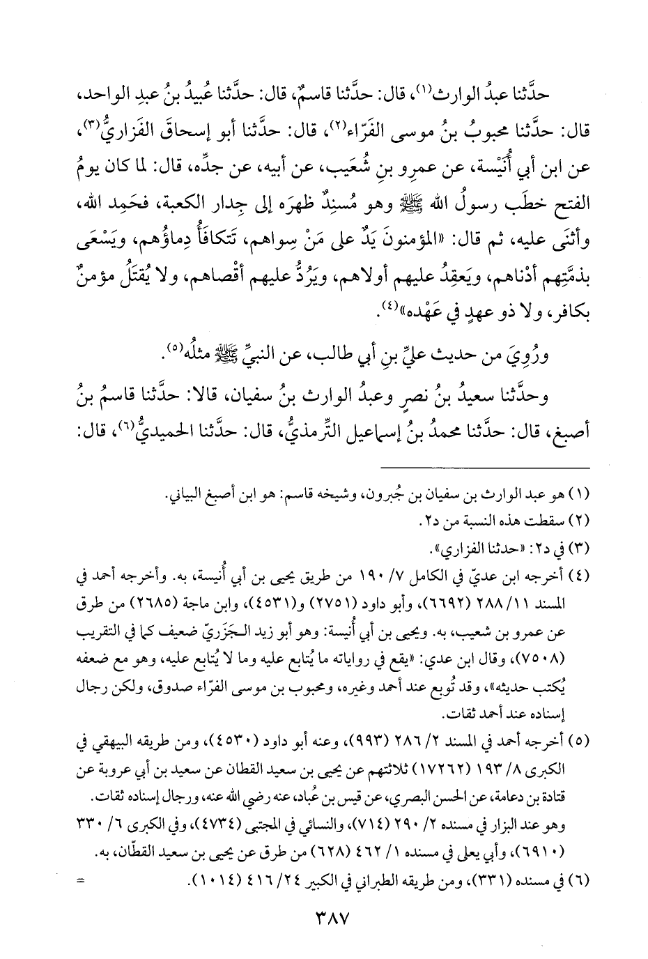 حدَّثنا عبدُ الوارث (¬١)، قال: حدَّثنا قاسمٌ، قال: حدَّثنا عُبيدُ بنُ عبدِ الواحد، قال: حدَّثنا محبوبُ بنُ موسى الفَرّاء (¬٢)، قال: حدَّثنا أبو إسحاقَ الفَزاريُّ (¬٣)، عن ابن أبي أُنيْسة، عن عمرِو بنِ شُعَيب، عن أبيه، عن جدِّه، قال: لما كان يومُ الفتح خطَب رسولُ اللَّه -صلى اللَّه عليه وسلم-وهو مُسنِدٌ ظهرَه إلى جِدار الكعبة، فحَمِد اللَّه، وأثنَى عليه، ثم قال: "المؤمنونَ يَدٌ على مَنْ سِواهم، تَتكافَأُ دِماؤُهم، ويَسْعَى بذمَّتِهم أدْناهم، ويَعقِدُ عليهم أولاهم، ويَرُدُّ عليهم أقْصاهم، ولا يُقتَلُ مؤمنٌ بكافر، ولا ذو عهدٍ في عَهْده" (¬٤).