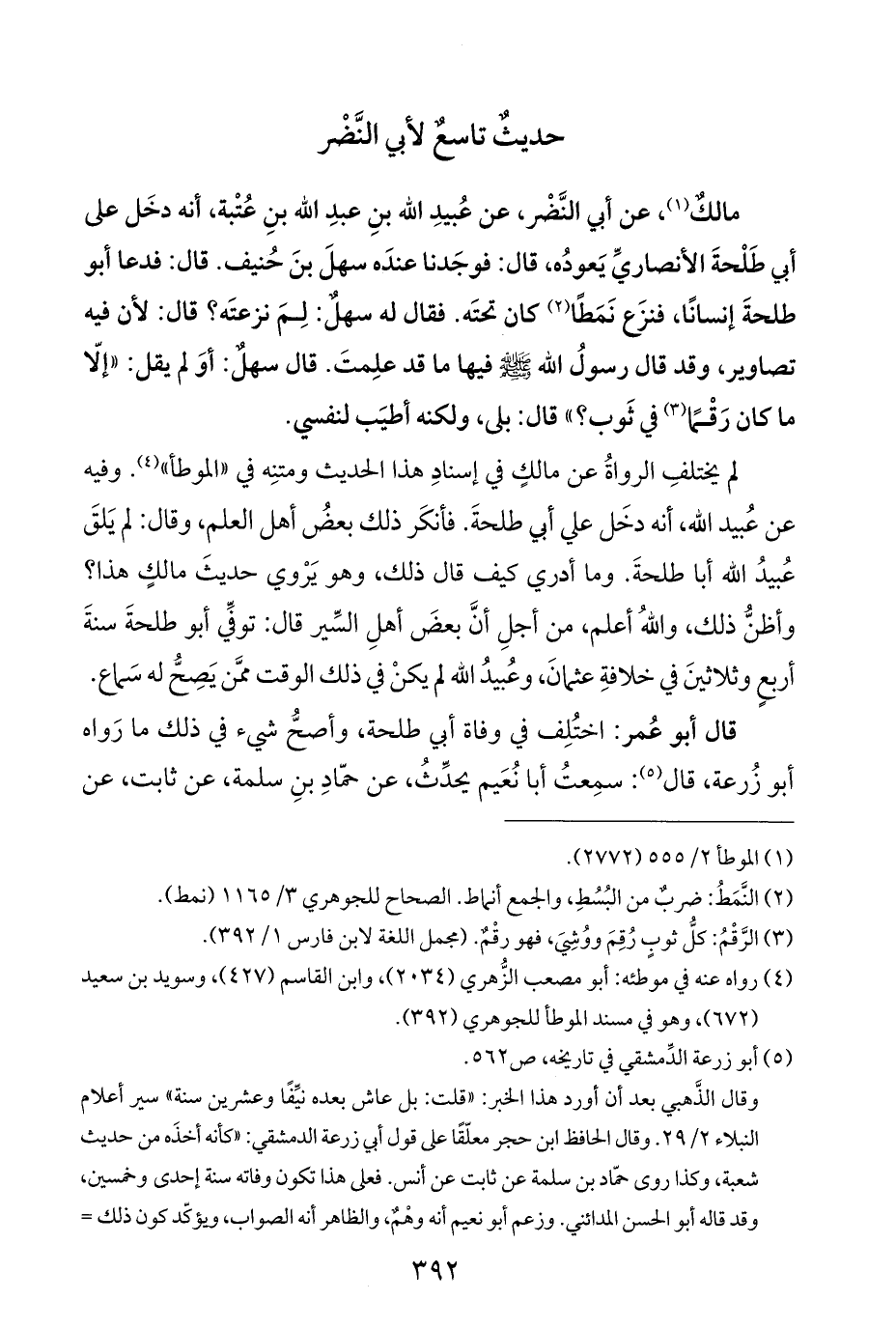 مالكٌ (¬١)، عن أبي النَّضْر، عن عُبيدِ اللَّه بنِ عبدِ اللَّه بنِ عُتْبة، أنه دخَل على أبي طَلْحةَ الأنصاريِّ يَعودُه، قال: فوجَدنا عندَه سهلَ بنَ حُنيف. قال: فدعا أبو طلحةَ إنسانًا، فنزَع نَمَطًا (¬٢) كان تحتَه. فقال له سهلٌ: لِمَ نزعتَه؟ قال: لأن فيه تصاوير، وقد قال رسولُ اللَّه -صلى اللَّه عليه وسلم- فيها ما قد علِمتَ. قال سهلٌ: أوَلم يقل: "إلّا ما كان رَقْمًا (¬٣) في ثَوب؟ " قال: بلى، ولكنه أطيَب لنفسي.