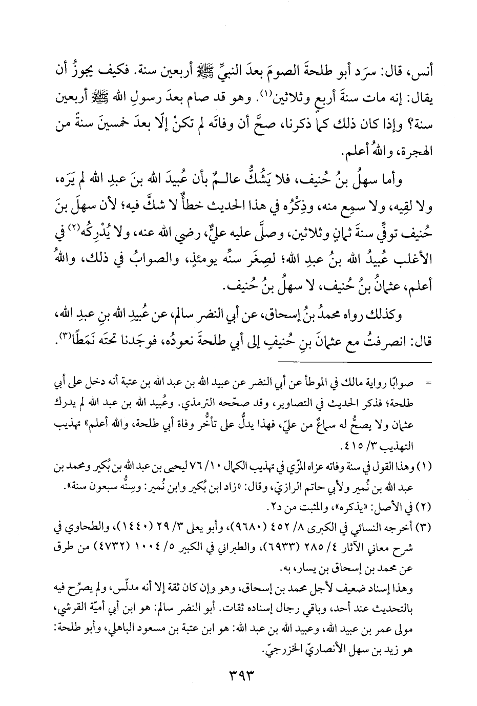 وهذا إسناد ضعيف لأجل محمد بن إسحاق، وهو وإن كان ثقة إلا أنه مدلّس، ولم يصرِّح فيه بالتحديث عند أحد، وباقي رجال إسناده ثقات. أبو النضر سالم: هو ابن أبي أميّة القرشي، مولى عمر بن عبيد اللَّه، وعبيد اللَّه بن عبد اللَّه: هو ابن عتبة بن مسعود الباهلي، وأبو طلحة: هو زيد بن سهل الأنصاريّ الخزرجيّ.