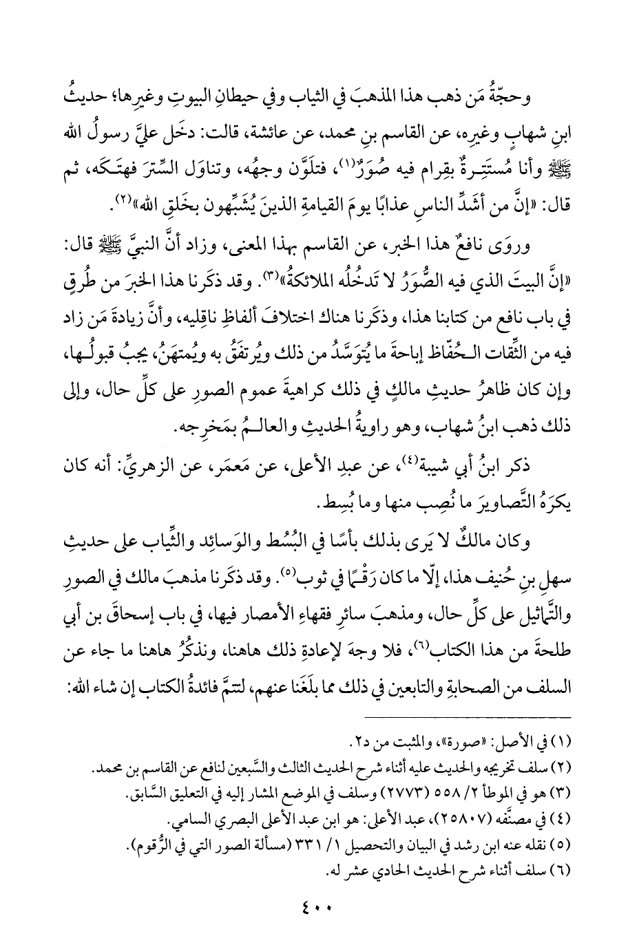 وكان مالكٌ لا يَرى بذلك بأسًا في البُسُط والوَسائِد والثِّياب على حديثِ سهلِ بنِ حُنيف هذا، إلّا ما كان رَقْمًا في ثوب (¬٥). وقد ذكَرنا مذهبَ مالك في الصورِ والتَّماثيل على كلِّ حال، ومذهبَ سائرِ فقهاءِ الأمصار فيها، في باب إسحاقَ بن أبي طلحةَ من هذا الكتاب (¬٦)، فلا وجهَ لإعادةِ ذلك هاهنا، ونذكُرُ هاهنا ما جاء عن السلف من الصحابةِ والتابعين في ذلك مما بلَغَنا عنهم، لتتمَّ فائدةُ الكتاب إن شاء اللَّه: