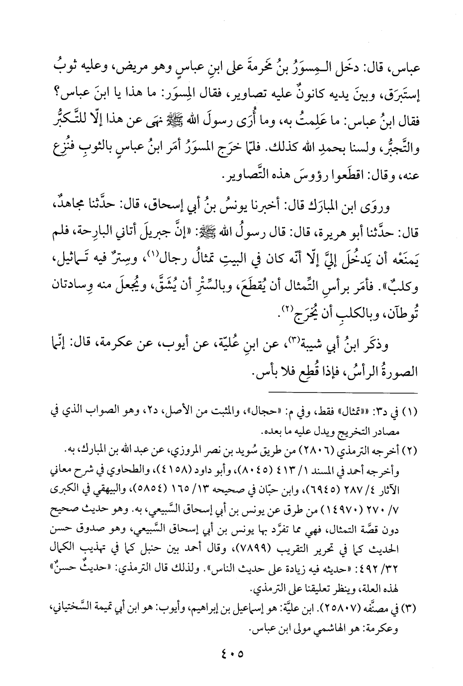 وروَى ابن المبارَك قال: أخبرنا يونسُ بنُ أبي إسحاق، قال: حدَّثنا مجاهدٌ، قال: حدَّثنا أبو هريرة، قال: قال رسولُ اللَّه -صلى اللَّه عليه وسلم-: "إنَّ جبريلَ أتاني البارِحة، فلم يَمنَعْه أن يَدخُلَ إليَّ إلّا أنّه كان في البيتِ تمثالُ رجال (¬١)، وسِترٌ فيه تَماثيل، وكلبٌ". فأمَر برأسِ التِّمثال أن يُقطَعَ، وبالسِّتْرِ أن يُشَقَّ، ويُجعلَ منه وِسادتان تُوطآن، وبالكلبِ أن يُخرَج (¬٢).