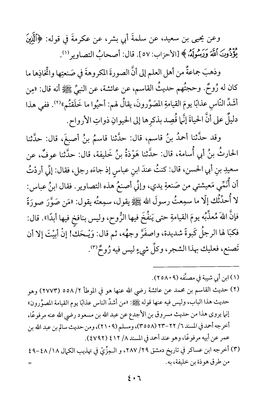 وقد حدَّثنا أحمدُ بنُ قاسم، قال: حدَّثنا قاسمُ بنُ أصبغَ، قال: حدَّثنا الحارثُ بنُ أبي أُسامة، قال: حدَّثنا هَوْذةُ بنُ خَليفة، قال: حدَّثنا عوفٌ، عن سعيدِ بنِ أبي الحسن، قال: كنتُ عندَ ابنِ عباسٍ إذ جاءَه رجل، فقال: إنِّي أردْتُ أن أُنَمِّي مَعيشتي من صَنعةِ يدي، وإنِّي أصنعُ هذه التصاوير. فقال ابنُ عباس: لا أُحدِّثُك إلّا ما سمِعتُ رسولَ اللَّه -صلى اللَّه عليه وسلم- يقول، سمِعتُه يقول: "مَن صَوَّرَ صورَةً فإنَّ اللَّهَ مُعذِّبُه يومَ القيامةِ حتى يَنفُخَ فيها الرُّوح، وليس بنافخٍ فيها أبدًا". قال: فكبَا لها الرجلُ كَبوةً شديدة، واصفَرَّ وجهُه، ثم قال: وَيْحَك! إنْ أبيْتَ إلا أن تَصنع، فعليك بهذا الشجر، وكلِّ شيءٍ ليس فيه رُوحٌ (¬٣).
