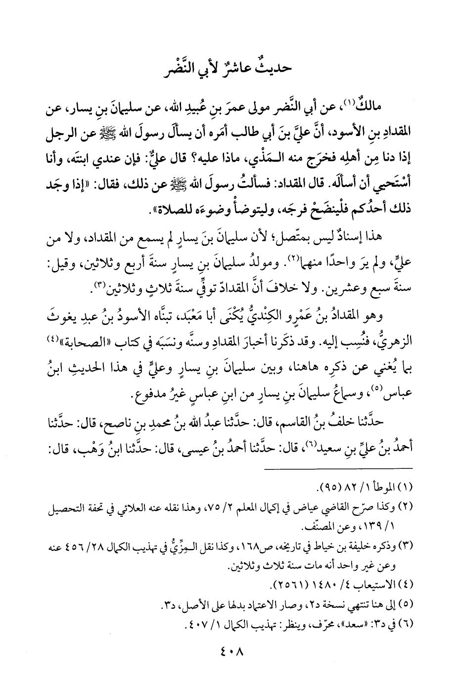 هذا إسنادٌ ليس بمتّصل؛ لأن سليمانَ بنَ يسارٍ لم يسمع من المقداد، ولا من عليٍّ، ولم يرَ واحدًا منهما (¬٢). ومولدُ سليمانَ بنِ يسارٍ سنةَ أربع وثلاثين، وقيل: سنةَ سبع وعشرين. ولا خلافَ أنَّ المقدادّ توفِّي سنةَ ثلاثٍ وثلاثين (¬٣).