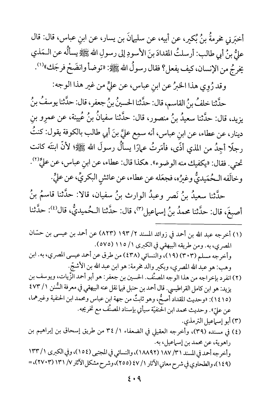 أخبَرني مخرمةُ بنُ بُكير، عن أبيه، عن سليمانَ بن يسار، عن ابنِ عباس، قال: قال عليُّ بنُ أبي طالب: أرسلتُ المقدادَ بنَ الأسودِ إلى رسولِ اللَّه -صلى اللَّه عليه وسلم- يسألُه عن المَذي يخرجُ من الإنسان، كيف يفعل؟ فقال رسولُ اللَّه -صلى اللَّه عليه وسلم-: "توضأ وانضَحْ فرجَك" (¬١).