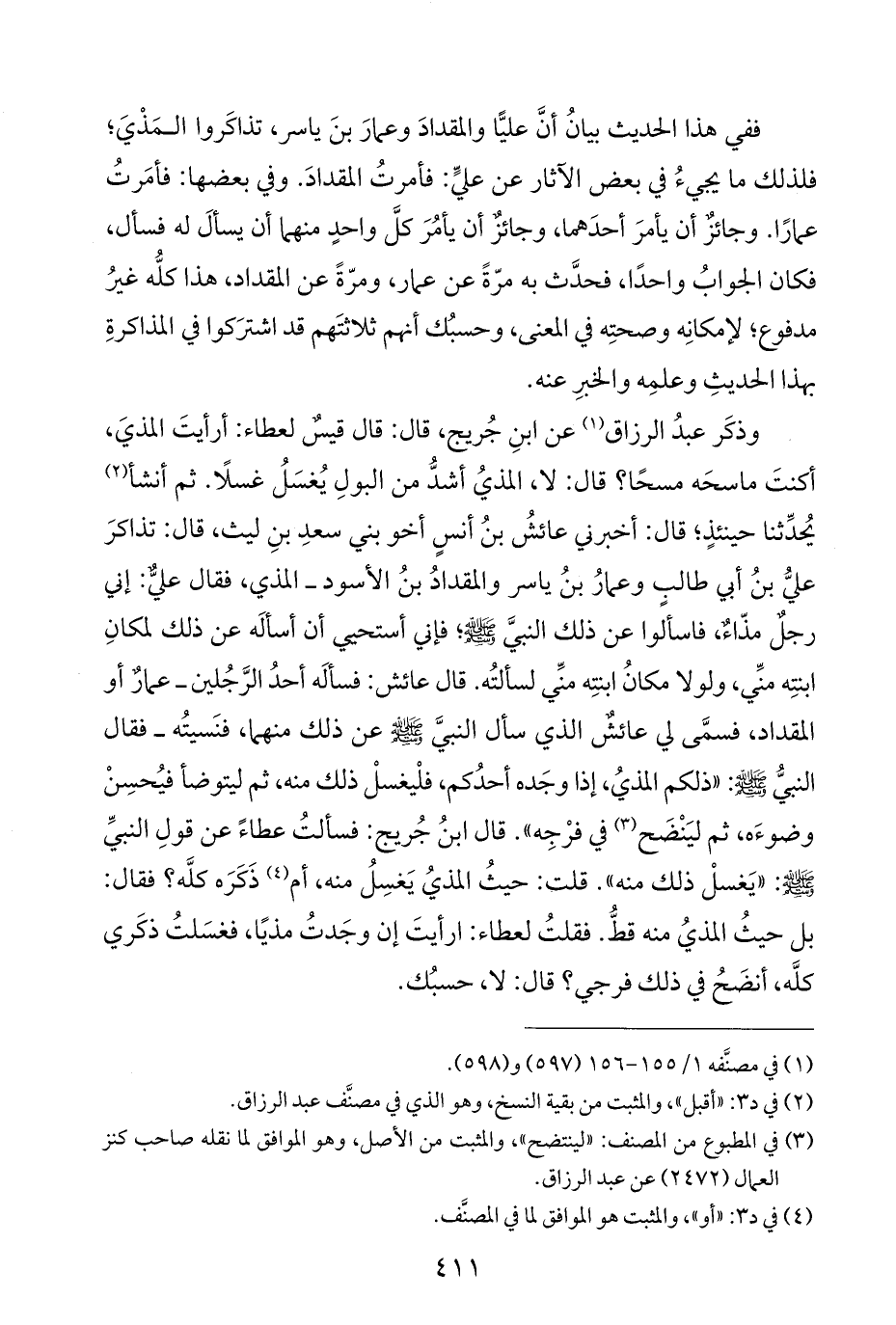 ففي هذا الحديث بيانُ أنَّ عليًّا والمقدادَ وعمارَ بنَ ياسر، تذاكَروا المَذْيَ؛ فلذلك ما يجيءُ في بعض الآثار عن عليٍّ: فأمرتُ المقدادَ. وفي بعضها: فأمَرتُ عمارًا. وجائزٌ أن يأمرَ أحدَهما، وجائزٌ أن يأمُرَ كلَّ واحدٍ منهما أن يسألَ له فسأل، فكان الجوابُ واحدًا، فحدَّث به مرّةً عن عمار، ومرّةً عن المقداد، هذا كلُّه غيرُ مدفوع؛ لإمكانِه وصحتِه في المعنى، وحسبُك أنهم ثلاثتَهم قد اشترَكوا في المذاكرةِ بهذا الحديثِ وعلمِه والخبرِ عنه.
