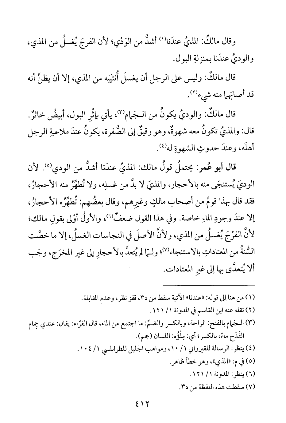 قال مالكٌ: والوديُ يكونُ من الجَمام (¬٣)، يأتي بإثْرِ البول، أبيضُ خاثرٌ. قال: والمذيُ تكونُ معه شهوةٌ، وهو رقيقٌ إلى الصُّفرة، يكونُ عندَ ملاعبةِ الرجل أهلَه، وعندَ حدوثِ الشهوةِ له (¬٤).