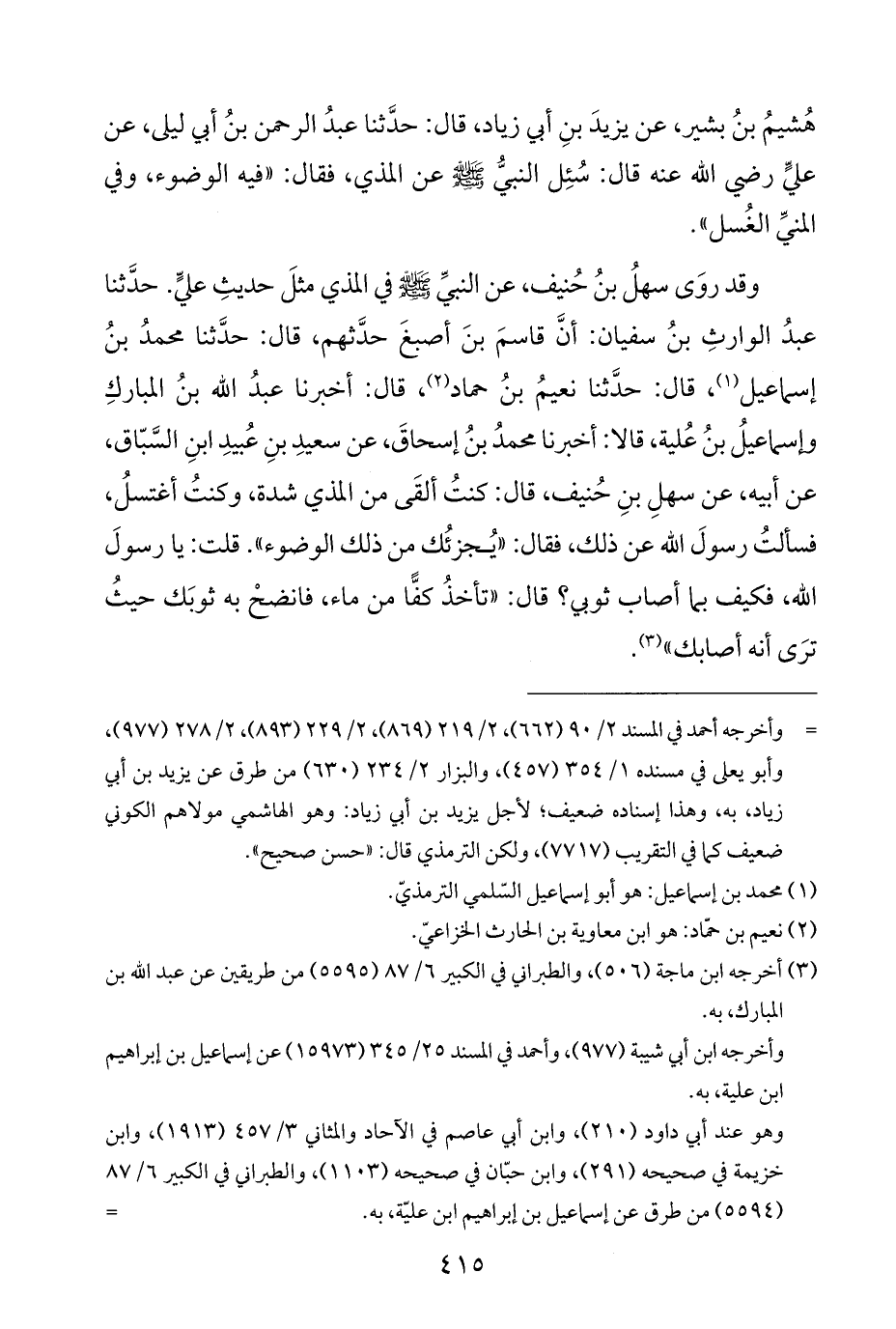 وقد روَى سهلُ بنُ حُنيف، عن النبيِّ -صلى اللَّه عليه وسلم- في المذي مثلَ حديثِ عليٍّ. حدَّثنا عبدُ الوارثِ بنُ سفيان: أنَّ قاسمَ بنَ أصبغَ حدَّثهم، قال: حدَّثنا محمدُ بنُ إسماعيل (¬١)، قال: حدَّثنا نعيمُ بنُ حماد (¬٢)، قال: أخبرنا عبدُ اللَّه بنُ المباركِ وإسماعيلُ بنُ عُلية، قالا: أخبرنا محمدُ بنُ إسحاقَ، عن سعيدِ بنِ عُبيدِ ابنِ السَّبّاق، عن أبيه، عن سهلِ بنِ حُنيف، قال: كنتُ ألقَى من المذي شدة، وكنتُ أغتسلُ، فسألتُ رسولَ اللَّه عن ذلك، فقال: "يُجزئُك من ذلك الوضوء". قلت: يا رسولَ اللَّه، فكيف بما أصاب ثوبي؟ قال: "تأخذُ كفًّا من ماء، فانضحْ به ثوبَك حيثُ ترَى أنه أصابك" (¬٣).