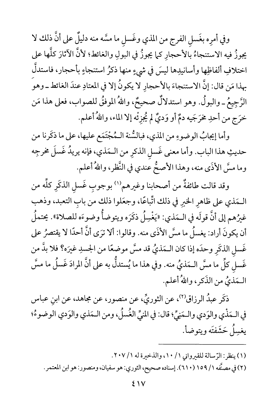ذكَر عبدُ الرزاق (¬٢)، عن الثوريِّ، عن منصور، عن مجاهد، عن ابنِ عباس في المَذْي والوَدي والمَنيِّ؛ قال: في المنيِّ الغُسلُ، ومن المَذي والوَدي الوضوءُ؛ يغسِلُ حَشَفتَه ويتوضأ.