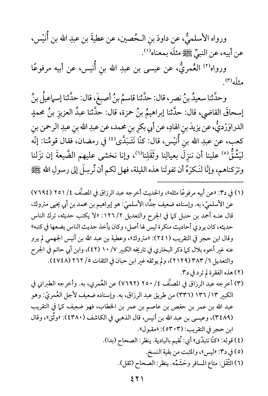 وحدَّثنا سعيدُ بنُ نصر، قال: حدَّثنا قاسمُ بنُ أصبغَ، قال: حدَّثنا إسماعيلُ بنُ إسحاقَ القاضي، قال: حدَّثنا إبراهيمُ بنُ حمزة، قال: حدَّثنا عبدُ العزيزِ بنُ محمدٍ الدراوَرْديُّ، عن يزيدَ بنِ الهادِ، عن أبي بكرِ بنِ محمد، عن عبدِ اللَّه بنِ عبدِ الرحمن بنِ كعب، عن عبدِ اللَّه بنِ أُنيْس، قال: كنّا نَتَبَدَّى (¬٤) في رمضان، فقال قومُنا: إنّه ليَشُقّ (¬٥) علينا أن ننزِلَ بعيالِنا وثَقَلِنا (¬٦)، وإنا نخشى عليهم الضَّيعةَ إن نزَلنا وترَكناهم، وإنّا لنَكرَهُ أن تفوتَنا هذه الليلة، فهل لكم أن نُرسِلَ إلى رسولِ اللَّه -صلى اللَّه عليه وسلم-