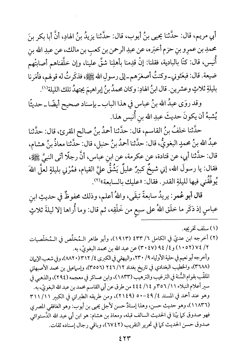 حدَّثنا خلفُ بنُ القاسم، قال: حدَّثنا أحمدُ بنُ صالح المقرئ، قال: حدَّثنا عبدُ اللَّه بنُ محمدٍ البغويُّ، قال: حدَّثنا أحمدُ بنُ حنبل، قال: حدَّثنا معاذُ بنُ هشام، قال: حدَّثنا أبي، عن قتادة، عن عكرمة، عن ابنِ عباس، أنَّ رجلًا أتَى النبيَّ -صلى اللَّه عليه وسلم-، فقال: يا رسولَ اللَّه، إني شيخٌ كبيرٌ عليلٌ يَشُقُّ عليَّ القيام، فمُرْني بليلةٍ لعلَّ اللَّهَ يُوفِّقُني فيها لليلةِ القدر. فقال: "عليك بالسابعة" (¬٢).