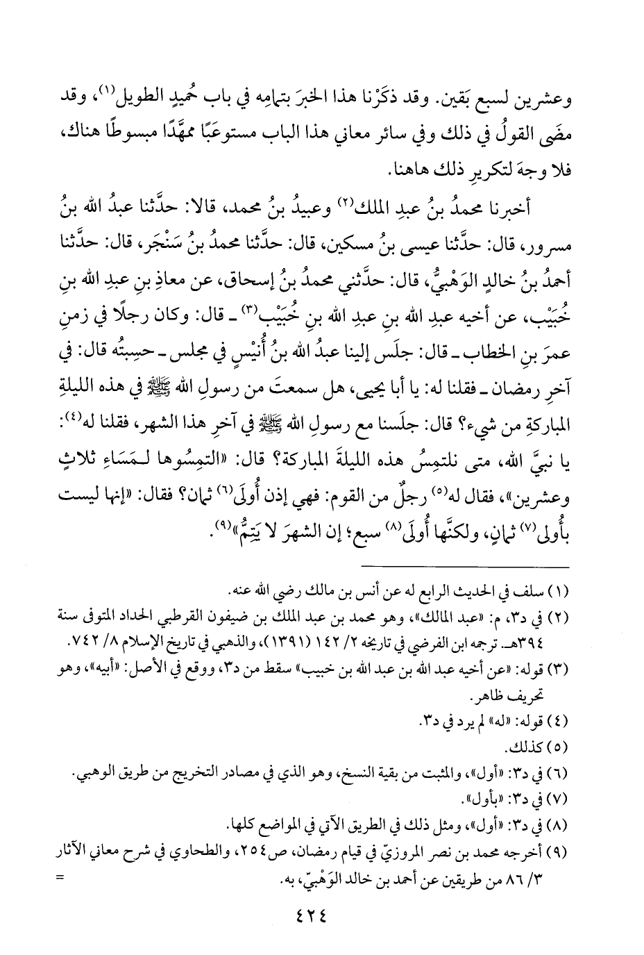 وعشرين لسبع بَقين. وقد ذكَرْنا هذا الخبرَ بتمامِه في باب حُميد الطويل (¬١)، وقد مضَى القولُ في ذلك وفي سائر معاني هذا الباب مستوعَبًا ممهَّدًا مبسوطًا هناك، فلا وجهَ لتكريرِ ذلك هاهنا.