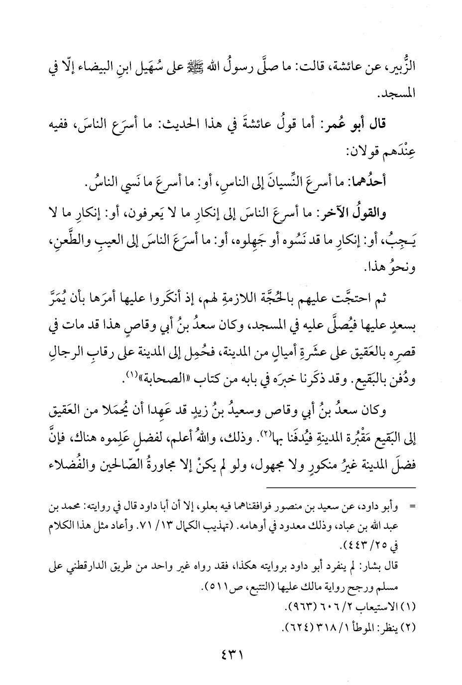 ثم احتجَّت عليهم بالحُجَّة اللازمةِ لهم، إذ أنكَروا عليها أمرَها بأن يُمَرَّ بسعدٍ عليها فيُصلَّى عليه في المسجد، وكان سعدُ بنُ أبي وقاصٍ هذا قد مات في قصرِه بالعَقيق على عشَرةِ أميالٍ من المدينة، فحُمِل إلى المدينة على رقابِ الرجالِ ودُفن بالبَقيع. وقد ذكَرنا خبرَه في بابه من كتاب "الصحابة" (¬١).