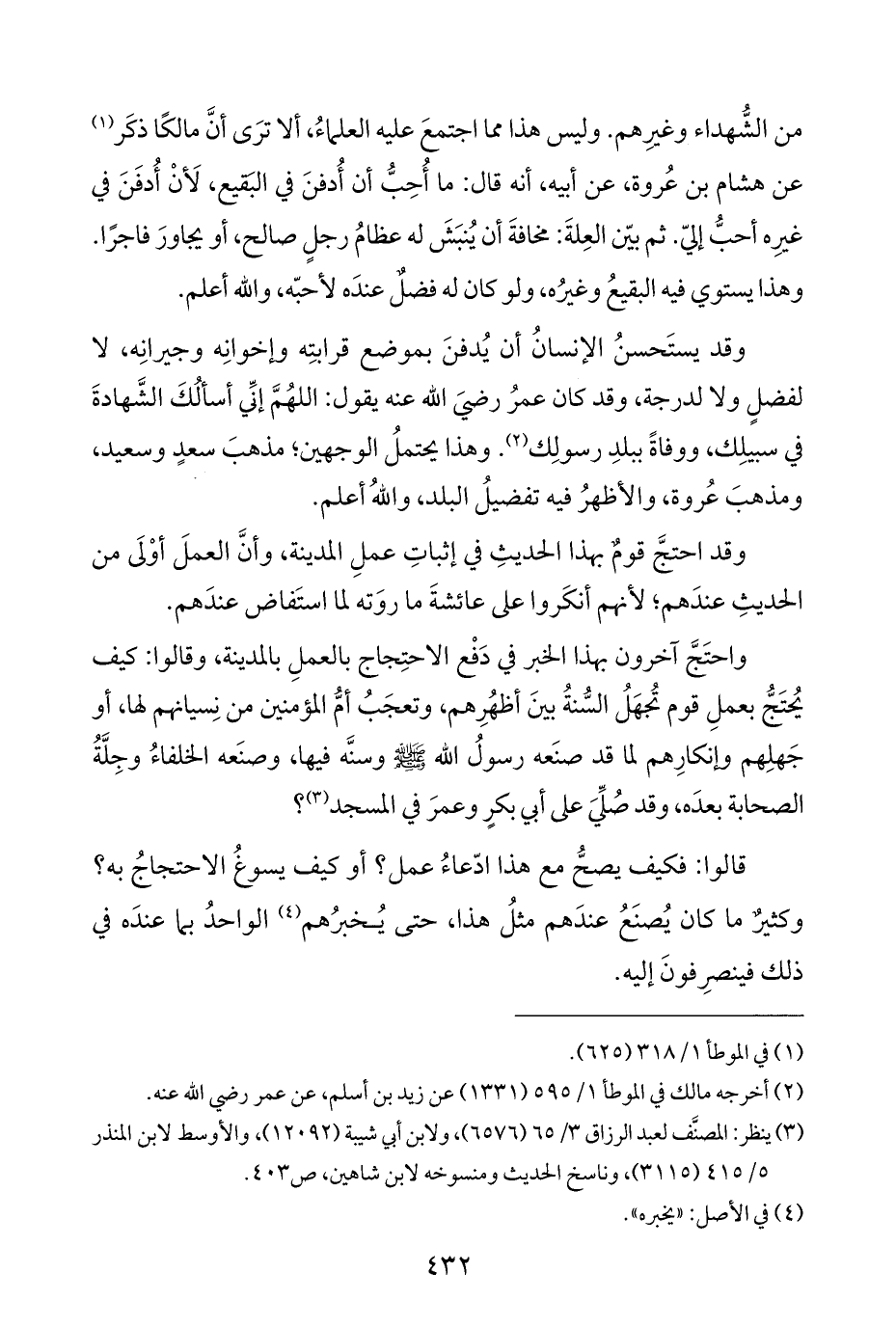 من الشُّهداء وغيرِهم. وليس هذا مما اجتمعَ عليه العلماءُ، ألا ترَى أنَّ مالكًا ذكَر (¬١) عن هشام بن عُروة، عن أبيه، أنه قال: ما أُحِبُّ أن أُدفنَ في البَقيع، لَأنْ أُدفَنَ في غيرِه أحبُّ إليّ. ثم بيّن العِلةَ: مخافةَ أن يُنبَشَ له عظامُ رجلٍ صالح، أو يجاورَ فاجرًا. وهذا يستوي فيه البقيعُ وغيرُه، ولو كان له فضلٌ عندَه لأحبّه، واللَّه أعلم.