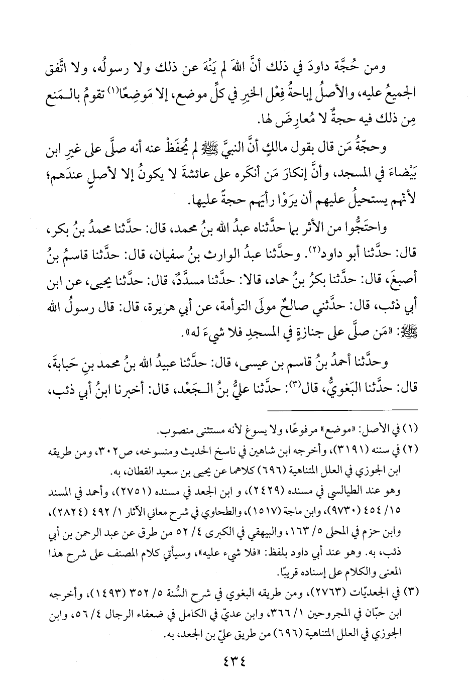 ومن حُجَّة داودَ في ذلك أنَّ اللَّهَ لم يَنْهَ عن ذلك ولا رسولُه، ولا اتَّفق الجميعُ عليه، والأصلُ إباحةُ فِعْل الخيرِ في كلِّ موضع، إلا مَوضِعًا (¬١) تقومُ بالمَنع مِن ذلك فيه حجةٌ لا مُعارِضَ لها.