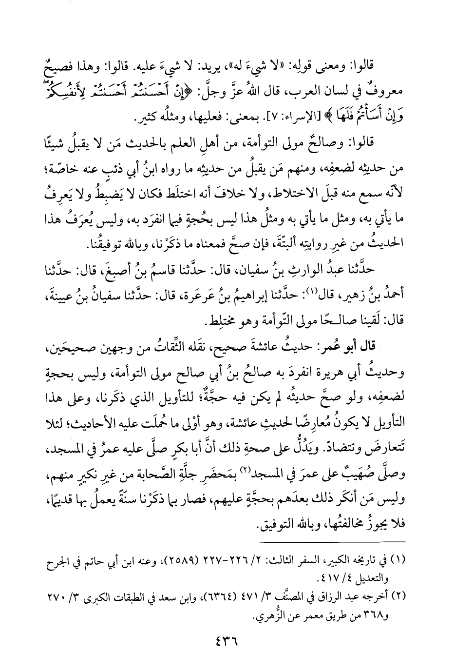قالوا: وصالحٌ مولى التوأمة، من أهلِ العلم بالحديث مَن لا يقبلُ شيئًا من حديثه لضعفِه، ومنهم مَن يقبلُ من حديثه ما رواه ابنُ أبي ذئبٍ عنه خاصّة؛ لانَّه سمع منه قبلَ الاختلاط، ولا خلافَ أنه اختلَط فكان لا يَضبِطُ ولا يَعرِفُ ما يأتي به، ومثل ما يأتي به ومثلُ هذا ليس بحُجةٍ فيما انفرَد به، وليس يُعرَفُ هذا الحديثُ من غيرِ روايتِه ألبتّةَ، فإن صحَّ فمعناه ما ذكَرْنا، وباللَّه توفيقُنا.