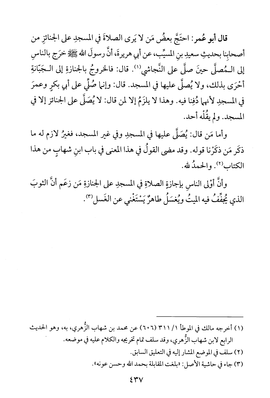 قال أبو عُمر: احتَجَّ بعضُ مَن لا يَرى الصلاةَ في المسجدِ على الجنائزِ من أصحابِنا بحديثِ سعيدِ بنِ المسيِّب، عن أبي هريرةَ، أنَّ رسولَ اللَّه -صلى اللَّه عليه وسلم- خرَج بالناسِ إلى المُصلَّى حينَ صلَّى على النَّجاشي (¬١). قال: فالخروجُ بالجنازةِ إلى الجَبّانةِ أحْرَى بذلك، ولا يُصلَّى عليها في المسجد. قال: وإنما صُلِّي على أبي بكرٍ وعمرَ في المسجدِ لأنهما دُفِنا فيه. وهذا لا يلزَمُ إلا لمن قال: لا يُصَلَّى على الجنائز إلا في المسجد. ولم يقُلْه أحد.