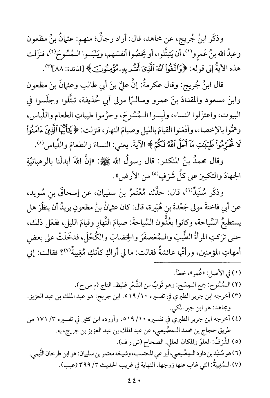 وذكَر ابنُ جُريج، عن مجاهد، قال: أراد رجالٌ؛ منهم: عثمانُ بنُ مظعون وعبدُ اللَّه بنُ عَمرٍو (¬١)، أن يَتبتَّلوا، أو يَخصُوا أنفسَهم، ويَلبَسوا المُسُوحَ (¬٢)، فنزَلت هذه الآيةُ إلى قوله: {وَاتَّقُوا اللَّهَ الَّذِي أَنْتُمْ بِهِ مُؤْمِنُونَ} [المائدة: ٨٨] (¬٣).