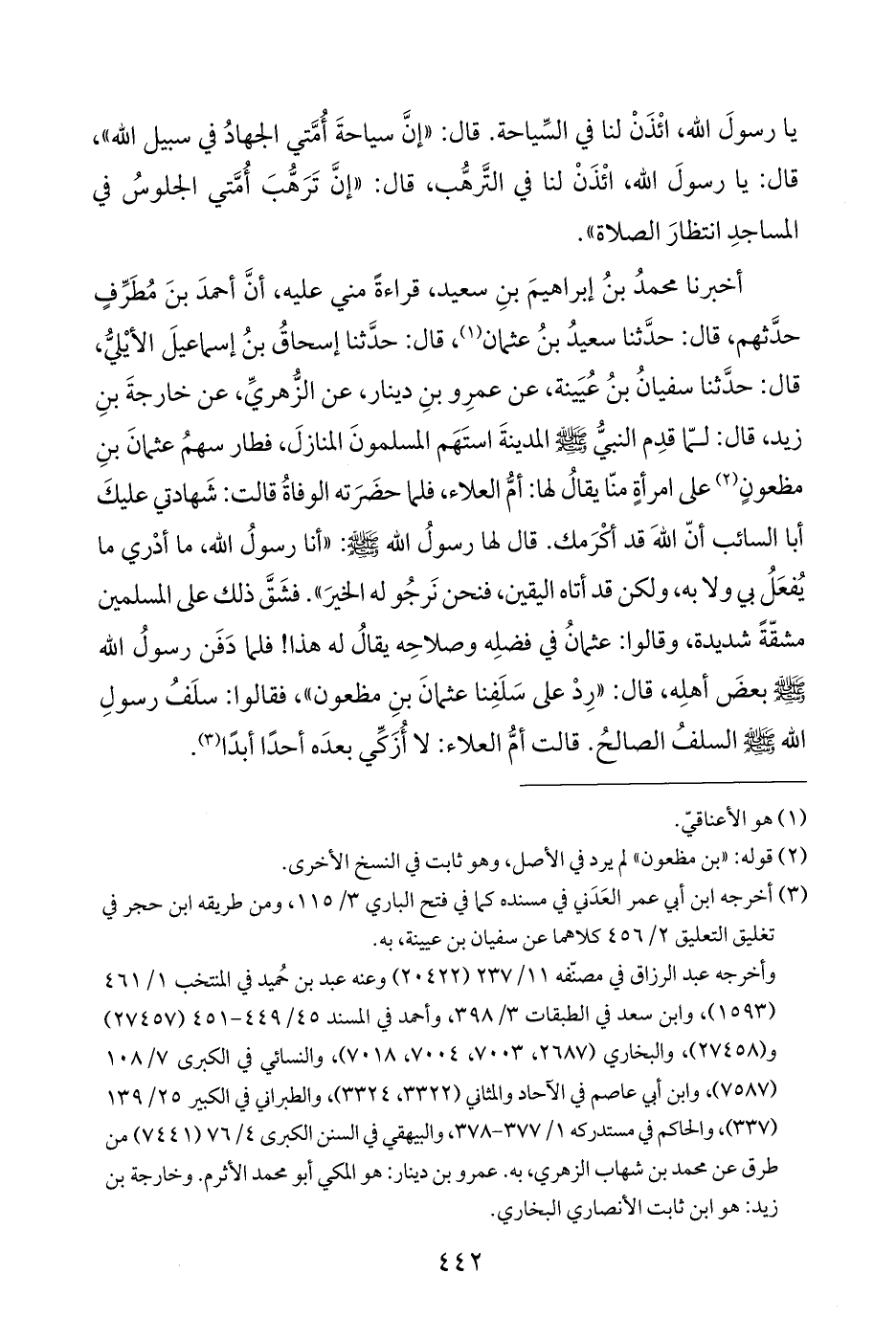 يا رسولَ اللَّه، ائْذَنْ لنا في السِّياحة. قال: "إنَّ سياحةَ أُمَّتي الجهادُ في سبيل اللَّه"، قال: يا رسولَ اللَّه، ائْذَنْ لنا في التَّرهُّب، قال: "إنَّ تَرَهُّبَ أُمَّتي الجلوسُ في المساجدِ انتظارَ الصلاة".